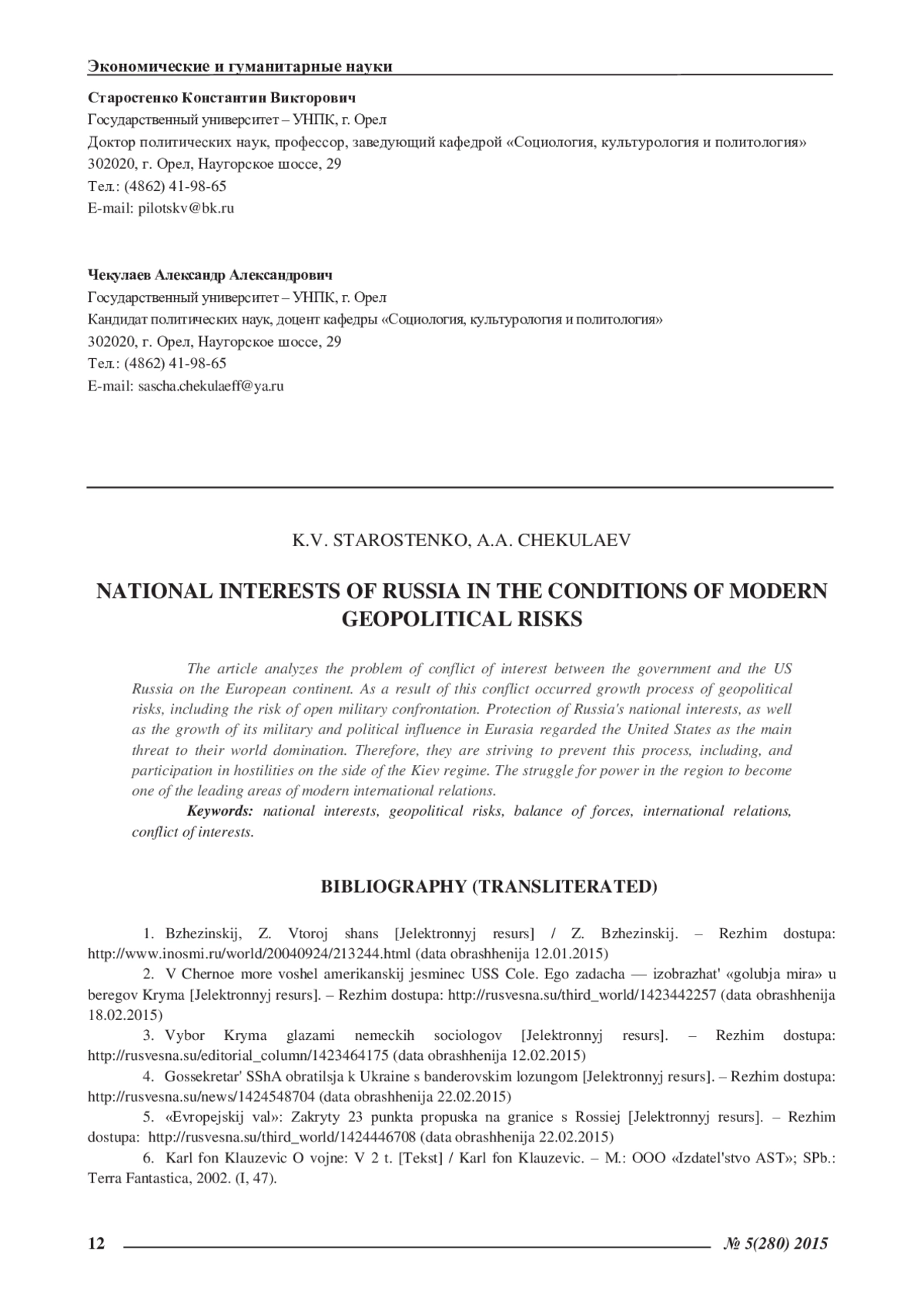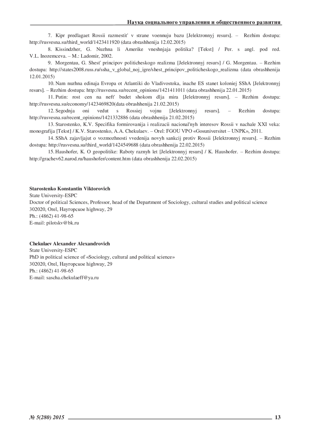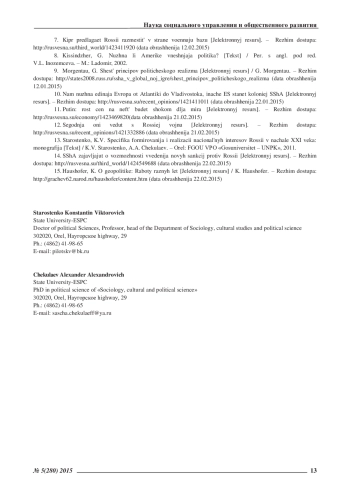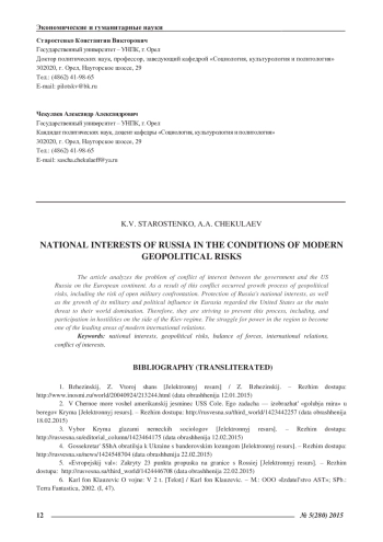 13. Старостенко, К.В. Специфика формирования и реализации национальных интересов России в начале XXI века: монография [Текст] / К.В. Старостенко, А.А. Чекулаев. - Орел: ФГОУ ВПО «Госуниверситет - УНПК», 2011. EDN: QPUNAP
