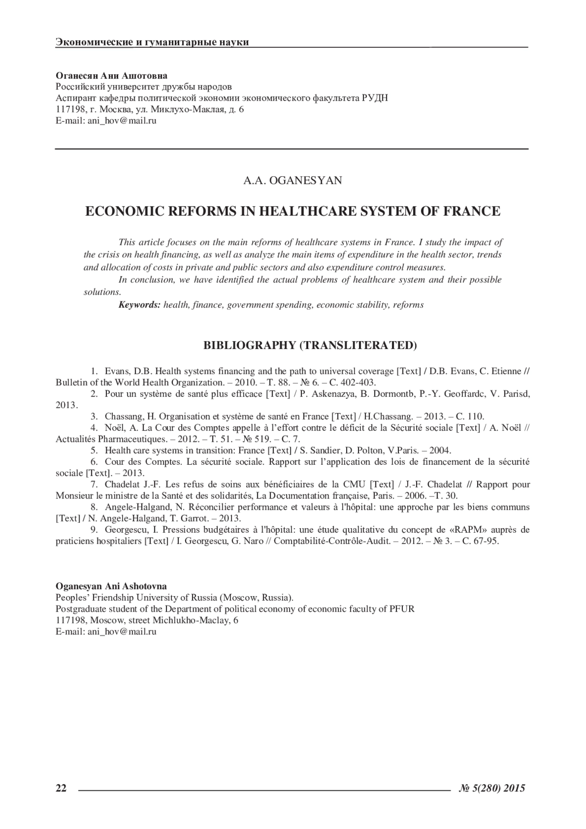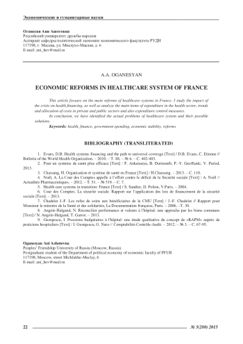 В статье проводится обзор основных экономических реформ здравоохранения во Франции. Исследуется влияние кризиса на финансирование здравоохранения, анализируются основные статьи расходов в сфере здравоохранения, тенденции распределения расходов в частном и государственном секторах, меры регулирования расходов, анализируются проводимые реформы в краткосрочной и долгосрочной перспективе. В заключение выделяются основные проблемы системы здравоохранения и перспективы решения