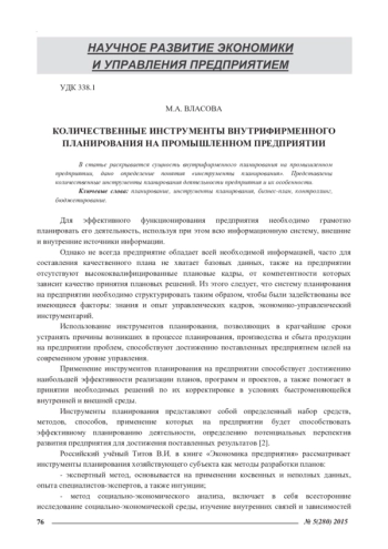 В статье раскрывается сущность внутрифирменного планирования на промышленном предприятии, дано определение понятия «инструменты планирования». Представлены количественные инструменты планирования деятельности предприятия и их особенности.