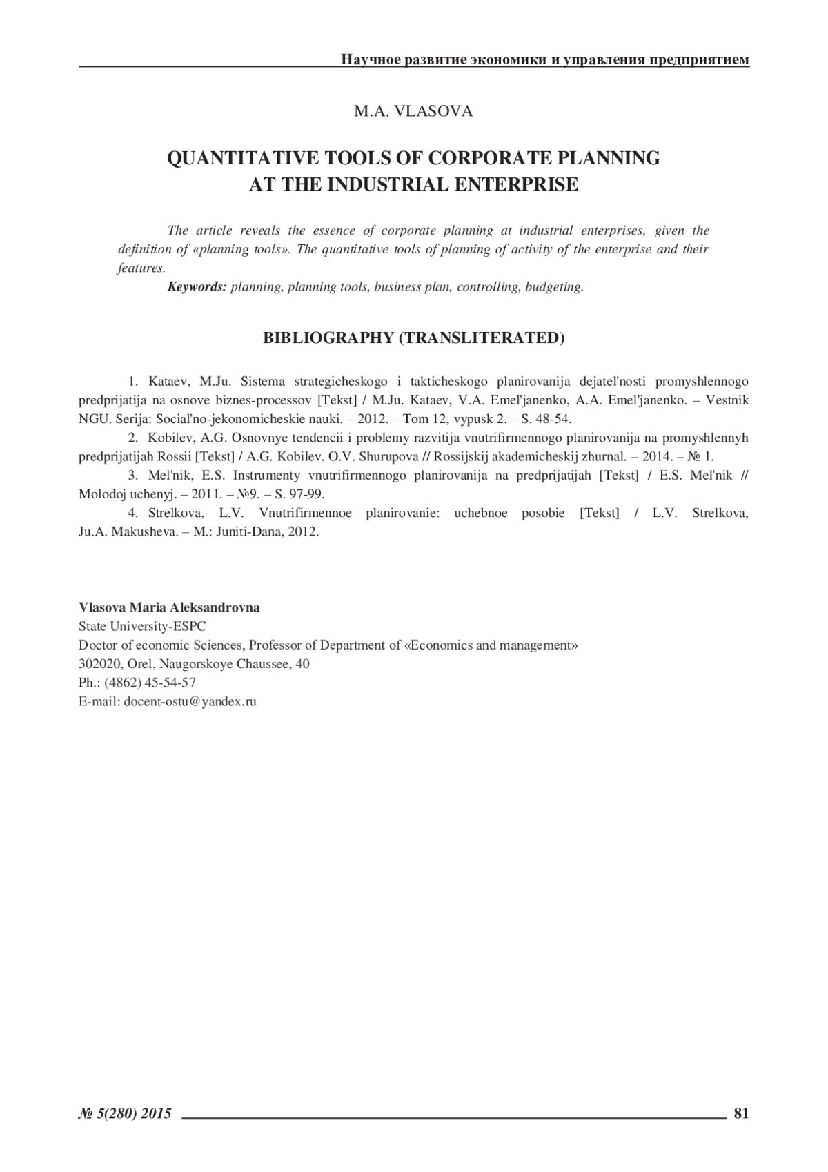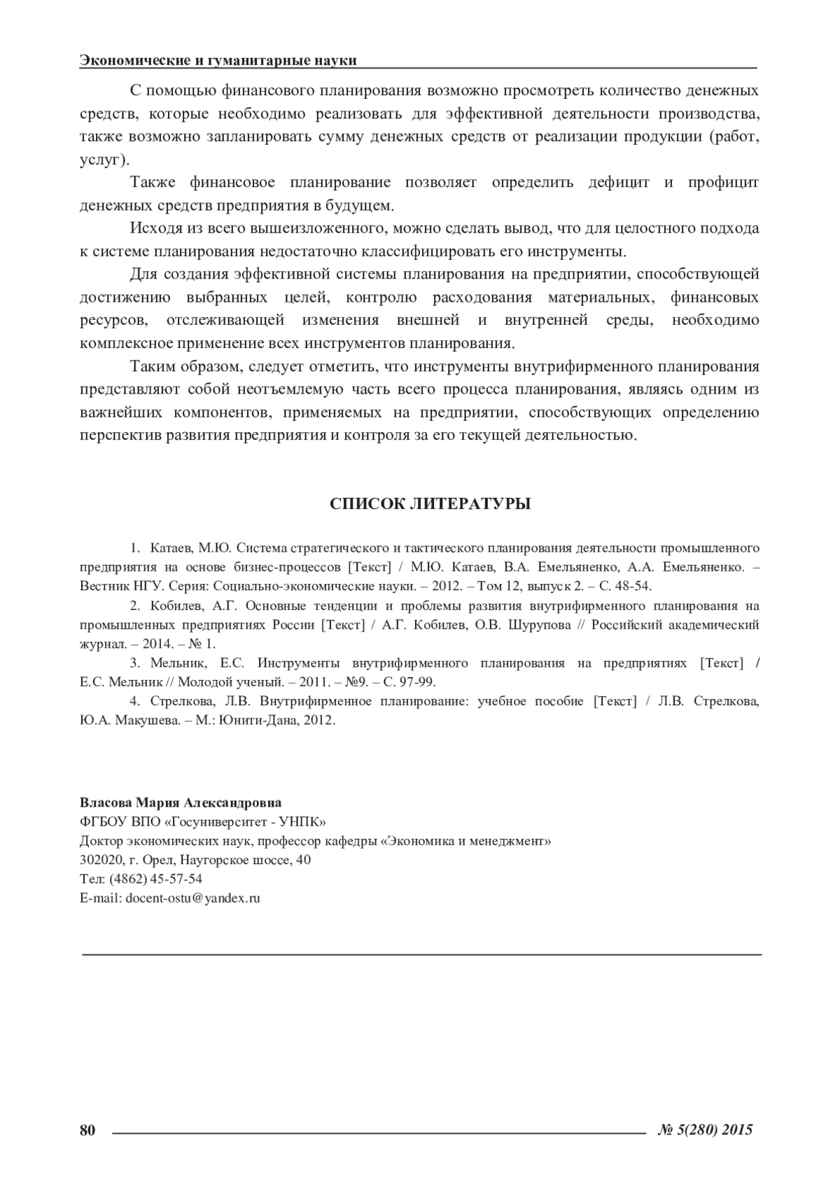 2. Кобилев, А.Г. Основные тенденции и проблемы развития внутрифирменного планирования на промышленных предприятиях России /А.Г. Кобилев, О.В. Шурупова//Российский академический журнал. -2014. -№ 1. EDN: SAHYMX