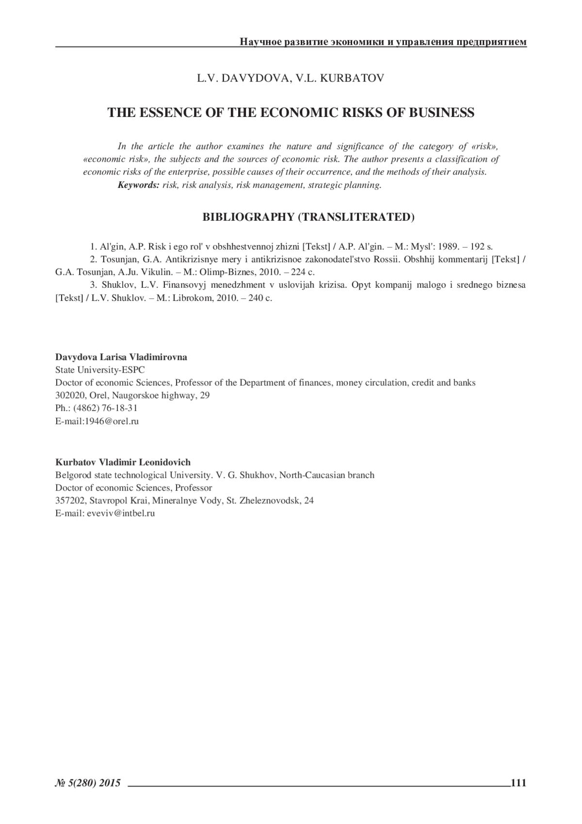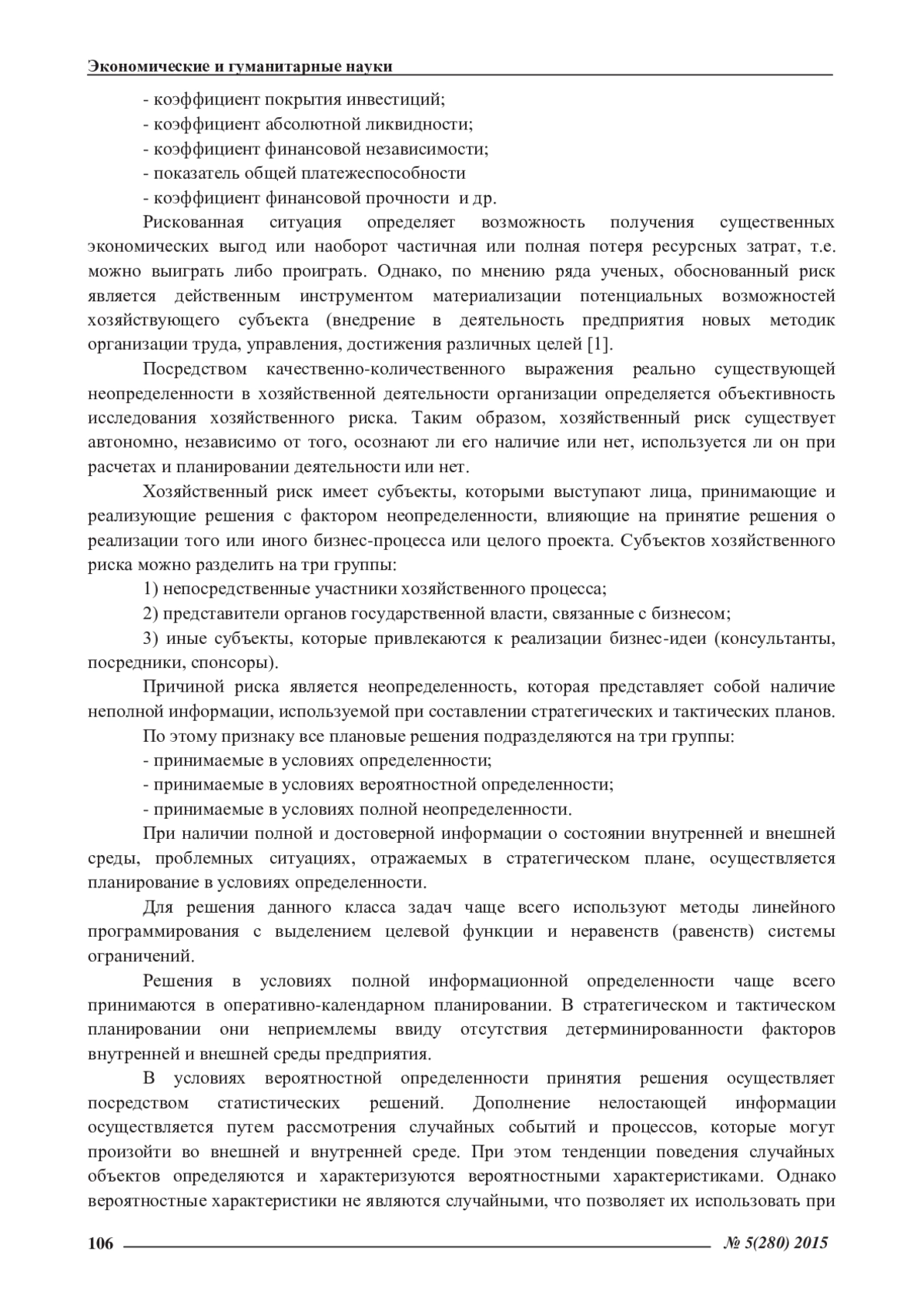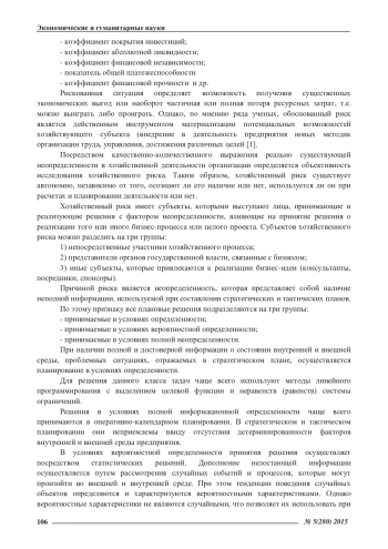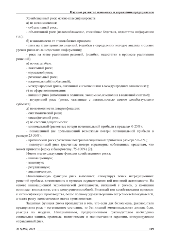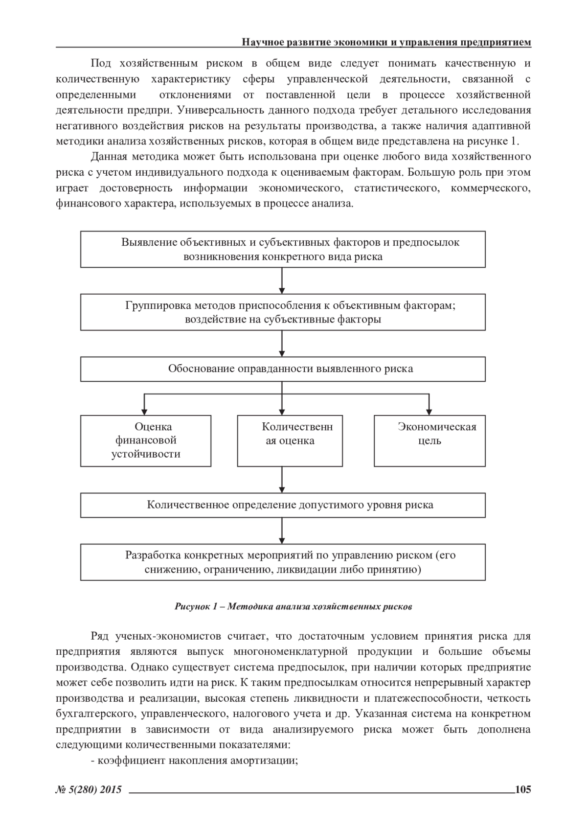 В статье автор рассматривает сущность и значение категории «риск», «хозяйственный риск», субъекты и источники хозяйственного риска. Автор представляет классификацию хозяйственных рисков предприятия, возможные причины их возникновения, а также методику их анализа