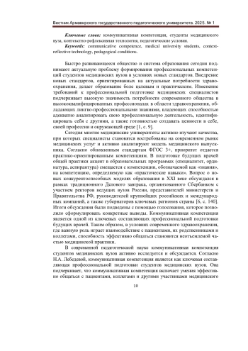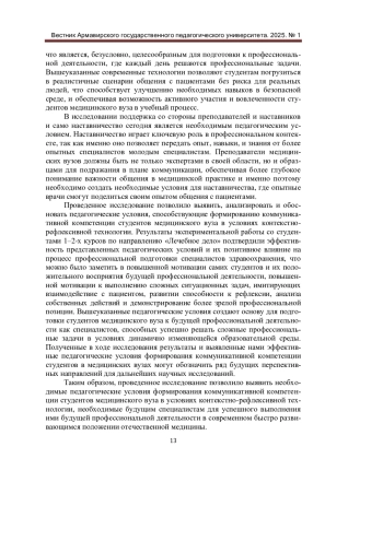 В статье рассматриваются особенности развития коммуникативной компетенции студентов медицинского вуза в условиях контекстно-рефлексивной технологии. Коммуникативная компетенция в образовательном пространстве медицинского вуза рассматривается как ключевой элемент профессиональной подготовки будущей профессиональной деятельности, необходимый для эффективного взаимодействия с пациентами, коллегами и сотрудниками здравоохранения. В статье обосновываются педагогические условия, способствующие успешному развитию коммуникативной компетенции, среди которых выделяются сами мотивы студентов медицинского вуза, активное использование интерактивных методов обучения, внедрение технологий виртуальной и дополненной реальности, поддержка со стороны преподавателей и наставников. Особое внимание уделяется рефлексии в контекстно-рефлексивной технологии как осмыслении студентами медицинского вуза своих профессиональных действий, их анализ и прогнозирование. Обозначена перспектива дальнейших исследований в данной области.