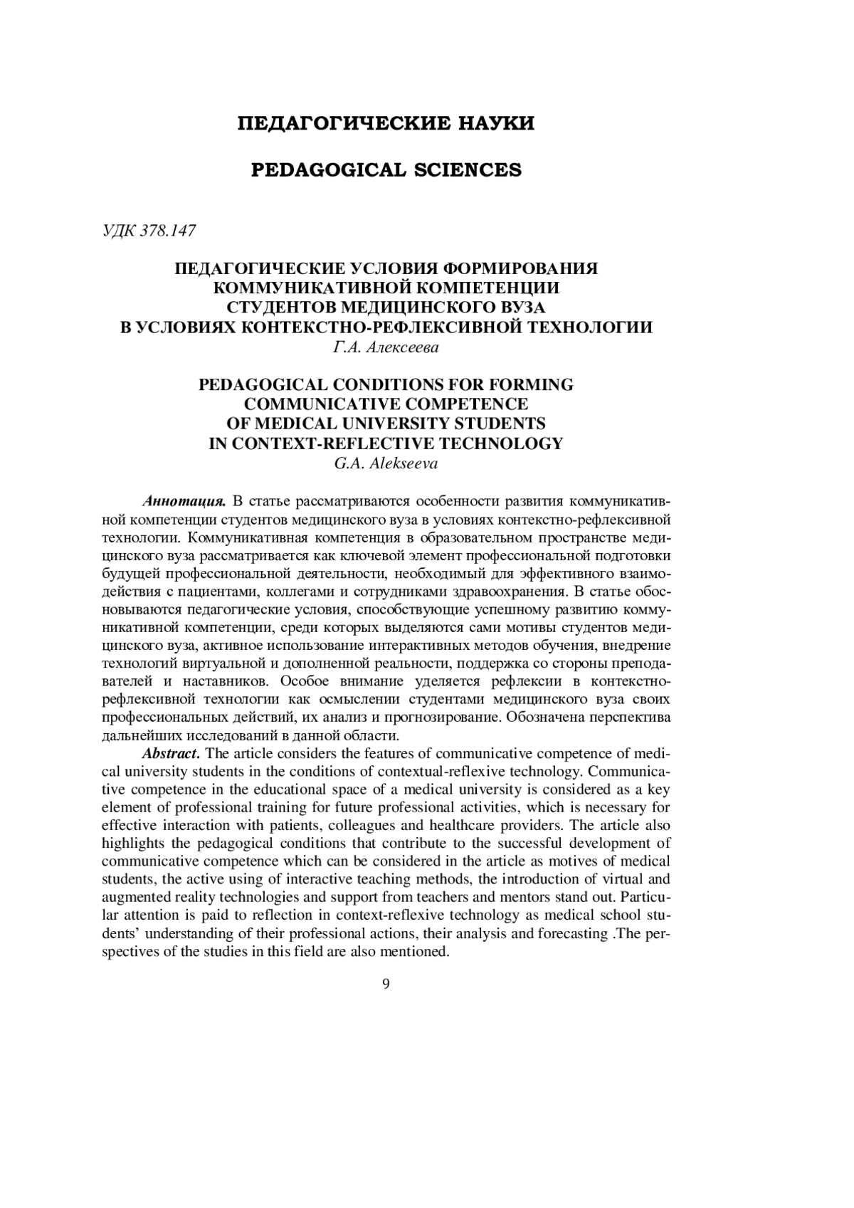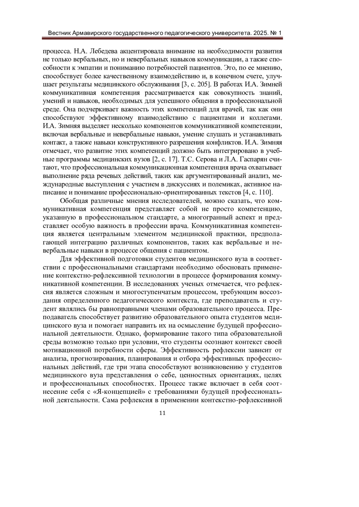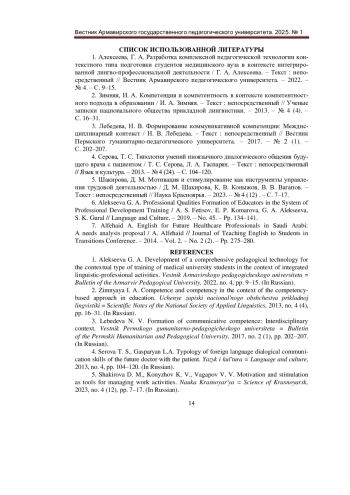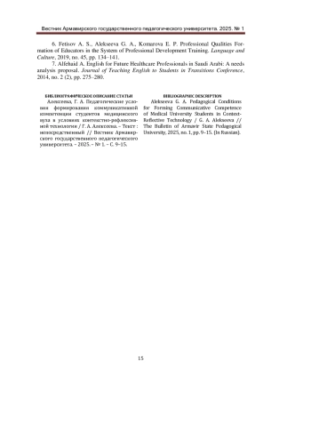 1. Алексеева, Г. А. Разработка комплексной педагогической технологии контекстного типа подготовки студентов медицинского вуза в контексте интегрированной лингво-профессиональной деятельности / Г. А. Алексеева. - Текст: непосредственный // Вестник Армавирского педагогического университета. - 2022. - № 4. - С. 9-15.