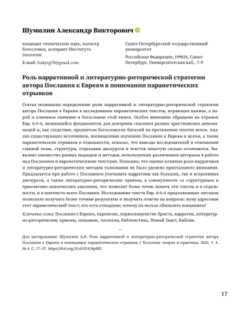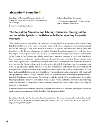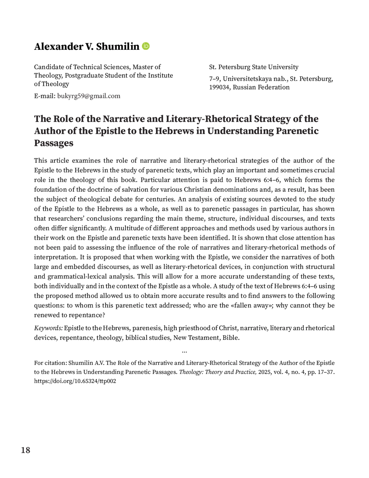 Статья посвящена определению роли нарративной и литературно-риторической стратегии автора Послания к Евреям в исследовании паренетических текстов, играющих важное, а порой и ключевое значение в богословии этой книги. Особое внимание обращено на отрывок Евр. 6:4–6, являющийся фундаментом для доктрины спасения разных христианских деноминаций и, как следствие, предметом богословских баталий на протяжении многих веков. Анализ существующих источников, посвященных изучению Послания к Евреям в целом, а также паренетических отрывков в отдельности, показал, что выводы исследователей в отношении главной темы, структуры, отдельных дискурсов и текстов зачастую сильно отличаются. Выявлено множество разных подходов и методов, используемых различными авторами в работе над Посланием и паренетическими текстами. Показано, что оценке влияния роли нарративов и литературно-риторических методов толкования не было уделено пристального внимания. Предлагается при работе с Посланием учитывать нарративы как больших, так и встроенных дискурсов, а также литературно-риторические приемы, в совокупности со структурным и грамматико-лексическим анализом, что позволит более точно понять эти тексты и в отдельности, и в контексте всего Послания. Исследование текста Евр. 6:4–6 предложенным методом позволило получить более точные результаты и получить ответы на вопросы: кому адресован этот паренетический текст; кто есть отпадшие; почему их нельзя обновлять покаянием?