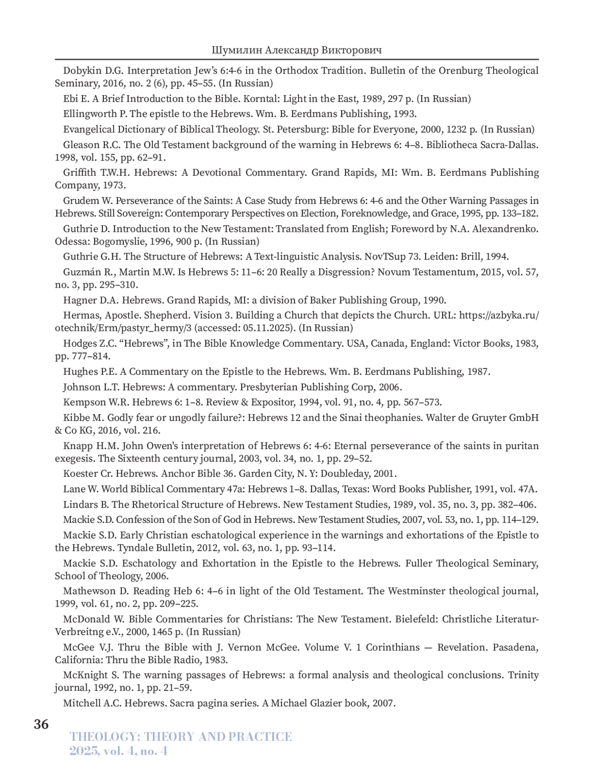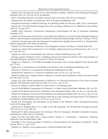 49. Mathewson D. Reading Heb 6: 4-6 in light of the Old Testament // The Westminster theological journal. 1999. Т. 61. № 2. P. 209-225.