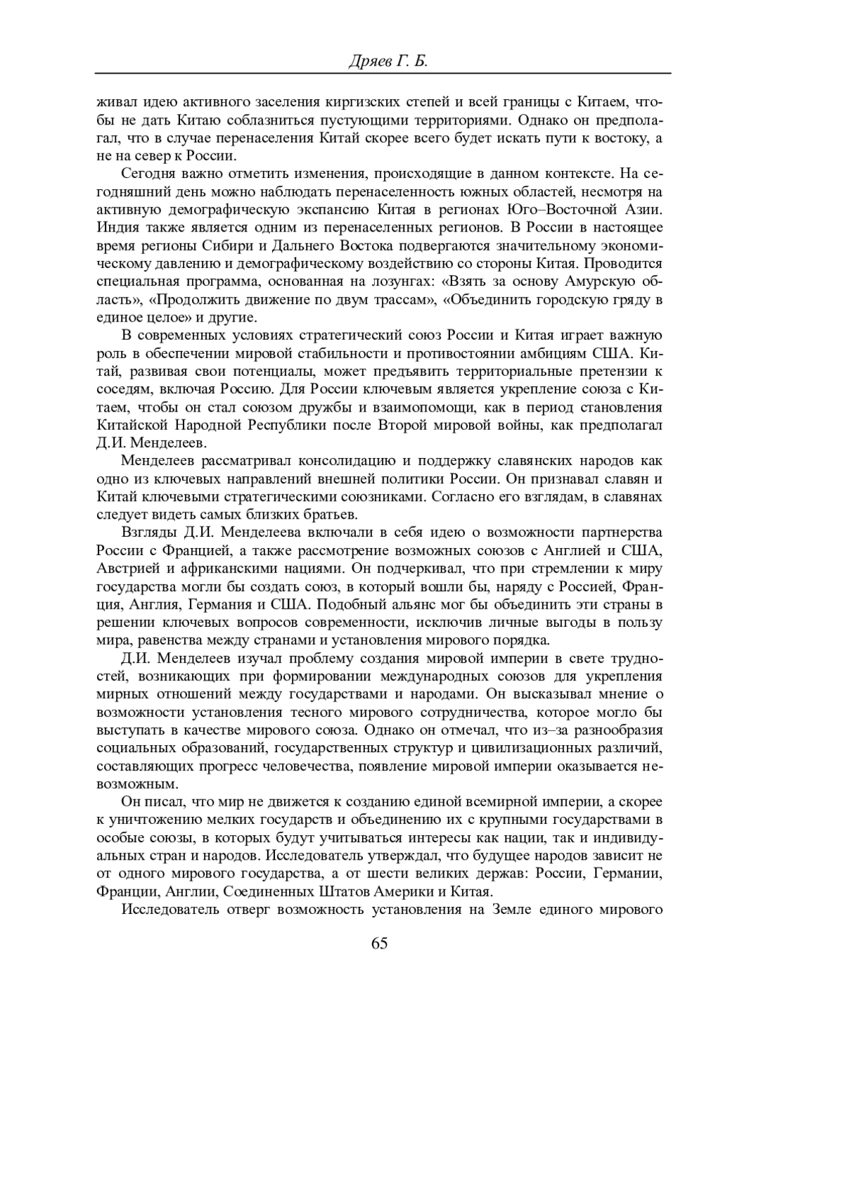 Политика является важной составляющей развития государства. Безусловно, Д. И. Менделеев, будучи государственным мыслителем, не мог пройти мимо проблем российского государства в данном направлении. Он был сторонником идеи миролюбивой политики на мировой арене. Многие мысли, поднятые им в его времена, находят свое отражение и в нынешних реалиях. Идеи Менделеева и сегодня вдохновляют на поиск новых решений в области права и государственного управления, подчеркивая необходимость продолжения интеграции научных достижений в правовую систему для обеспечения устойчивого развития общества и государства. Его предложения и взгляды служат основой для дальнейших исследований и разработок в области права, экономики и управления, подчеркивая важность научного подхода в решении социальных и экономических задач на государственном и международном уровнях.