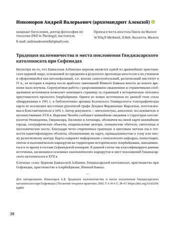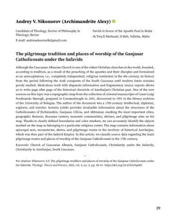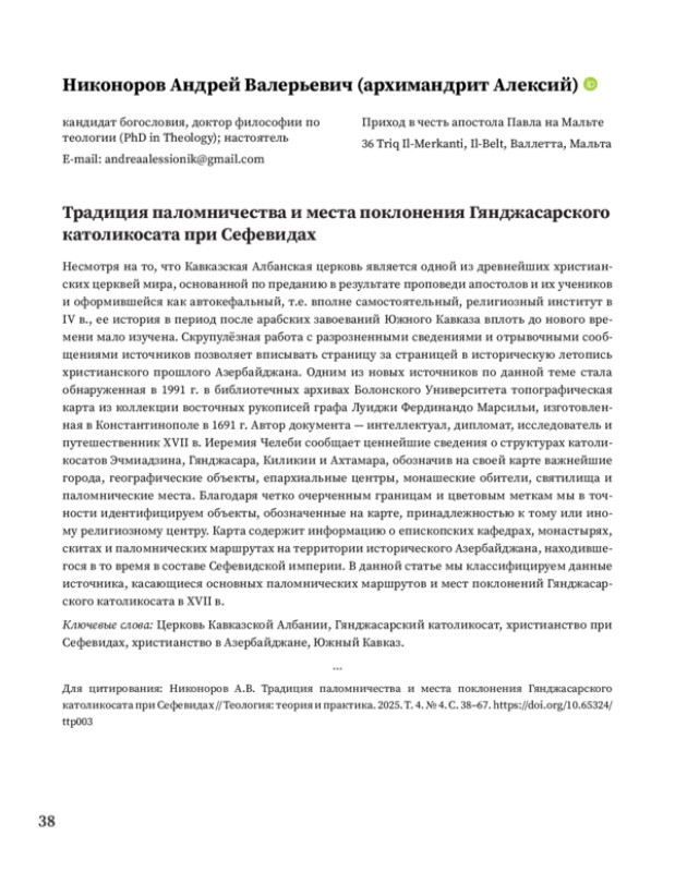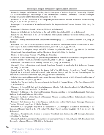 29. Никоноров А.В. Топографическая карта из коллекции Л.Ф. Марсильи как источник по истории Кавказской Албанской церкви в XVII веке // Теология: теория и практика. 2025. Т. 4. № 2. С. 84-92.