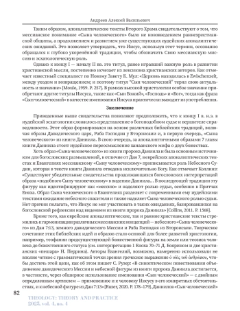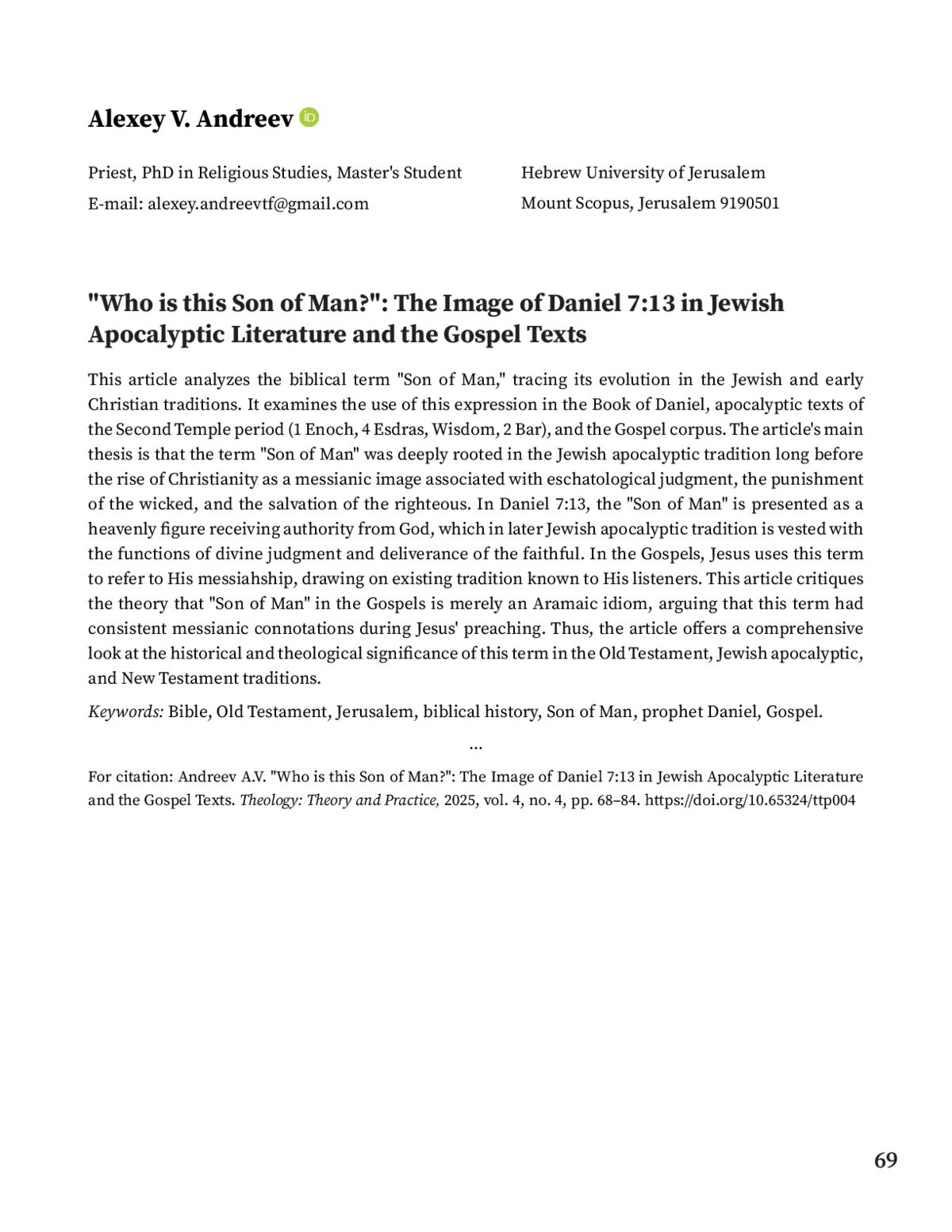 Статья посвящена анализу библейского термина «Сын человеческий», прослеживая его эволюцию в иудейской и раннехристианской традициях. Исследуется употребление этого выражения в книге пророка Даниила, апокалиптических текстах эпохи Второго Храма (1 Енох, 4 Ездры, Прем, 2 Вар) и евангельском корпусе. Основной тезис статьи заключается в том, что термин «Сын человеческий» задолго до возникновения христианства был глубоко укоренён в иудейской апокалиптической традиции как мессианский образ, связанный с эсхатологическим судом, наказанием нечестивых и спасением праведных. В Дан 7:13 «Сын человеческий» предста- ёт как небесная фигура, получающая власть от Бога, которая более поздней апокалиптической иудейской традиции наделяется функциями Божественного суда и избавления верных. В Евангелиях Иисус использует этот термин для указания на Свое мессианство, обращаясь к существующей традиции, известной Его слушателям. В статье критикуется теория, согласно которой «Сын человеческий» в Евангелиях является лишь арамейской идиомой, и утверждается, что этот термин во время проповеди Иисуса имел устойчивые мессианские коннотации. Тем самым, в статье предлагается комплексный взгляд на историческое и богословское значение этого термина в ветхозаветной, иудейской апокалиптической и новозаветной традициях.