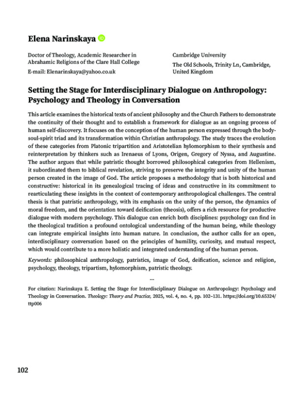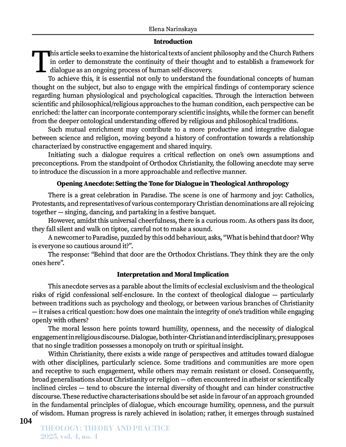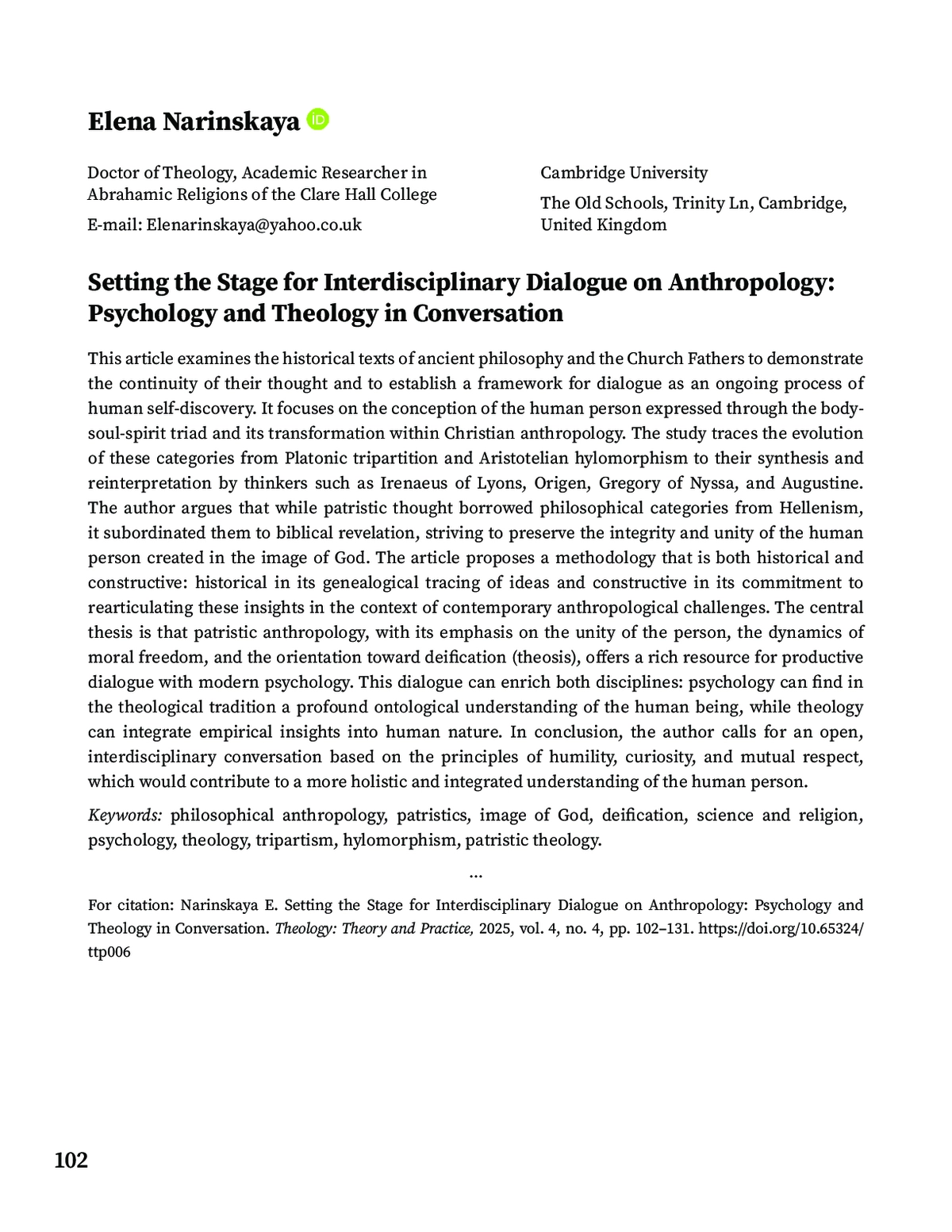 Данная статья исследует исторические тексты древней философии и трудов отцов церкви с целью демонстрации преемственности их мысли и установления основы для диалога как непрерывного процесса человеческого самопознания. В центре внимания находится концепция человека, выраженная через триаду «тело-душа-дух», и ее преобразование в рамках христианской антропологии. Исследование прослеживает эволюцию этих категорий от платоновского трипартизма и аристотелевского гилеморфизма до их синтеза и переосмысления у таких мыслителей, как Ириней Лионский, Ориген, Григорий Нисский и Августин. Автор утверждает, что, хотя патристическая мысль и заимствовала философские категории эллинизма, она подчинила их библейскому откровению, стремясь сохранить целостность и единство человеческой личности, созданной по образу Божию. Статья предлагает методологию, которая является одновременно исторической и конструктивной: исторической в генеалогическом прослеживании идей и конструктивной в стремлении переосмыслить эти инсайты в контексте современных антропологических вызовов. Основной тезис заключается в том, что патристическая антропология, с ее акцентом на единстве личности, динамике нравственной свободы и ориентации на обожение (theosis), предлагает богатый ресурс для продуктивного диалога с современной психологией. Этот диалог может обогатить обе дисциплины: психология может найти в теологической традиции глубину онтологического понимания человека, а теология — интегрировать эмпирические инсайты о человеческой природе. В заключение автор призывает к открытому, междисциплинарному разговору, основанному на принципах смирения, любознательности и взаимного уважения, который способствовал бы более целостному и интегрированному пониманию человеческой личности.