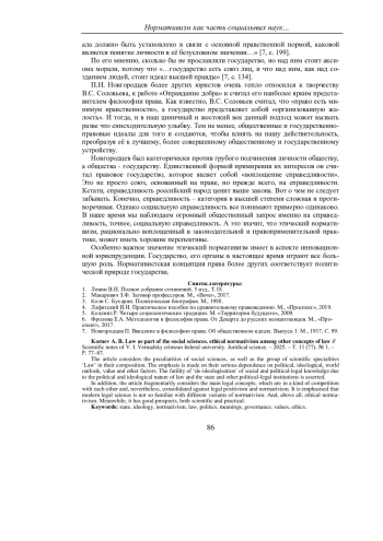 Кроме того, в статье фрагментарно рассматриваются основные правовые концепции, которые находятся в своеобразной конкуренции между собой и, тем не менее, консолидировано выступают против юридического позитивизма и нормативизма. Подчеркивается, что современная юридическая наука не столь хорошо знакома с различными вариантами нормативизма. И, прежде всего, этического. Между тем, у него есть хорошие перспективы, как научные, так и практические.