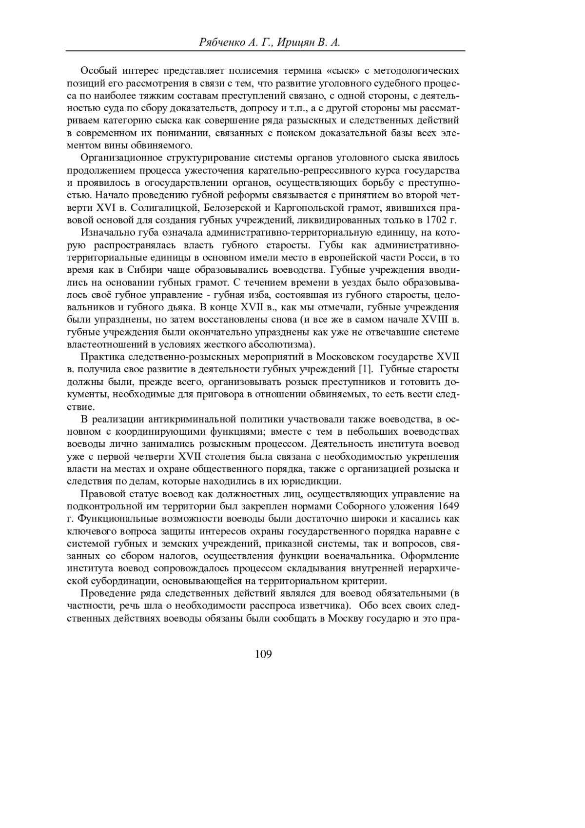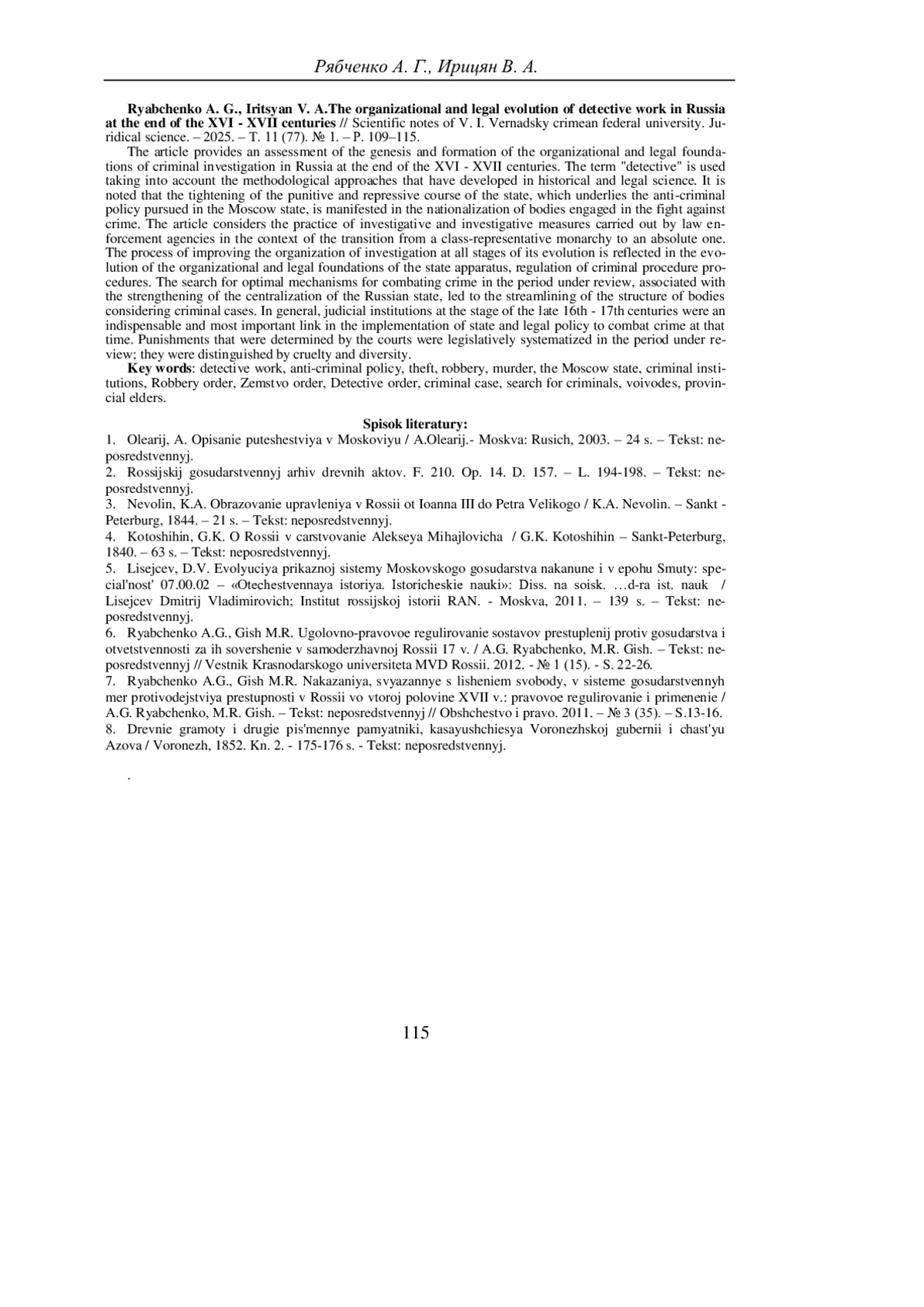 6. Рябченко А.Г., Гиш М.Р. Уголовно-правовое регулирование составов преступлений против государства и ответственности за их совершение в самодержавной России 17 в. / А.Г. Рябченко, М.Р. Гиш. - Текст: непосредственный // Вестник Краснодарского университета МВД России. 2012. - № 1 (15). - С. 22-26. EDN: PWZIKT