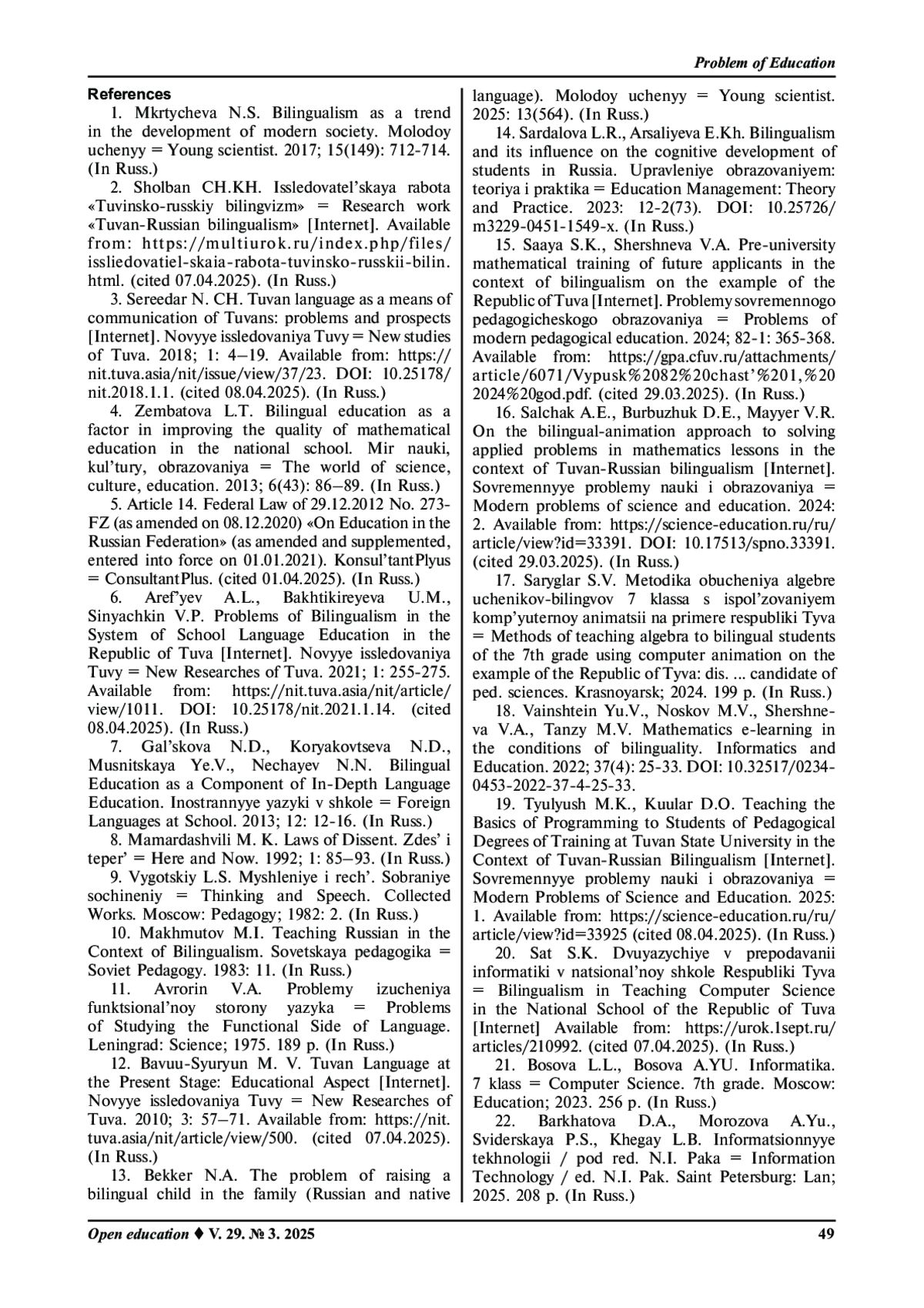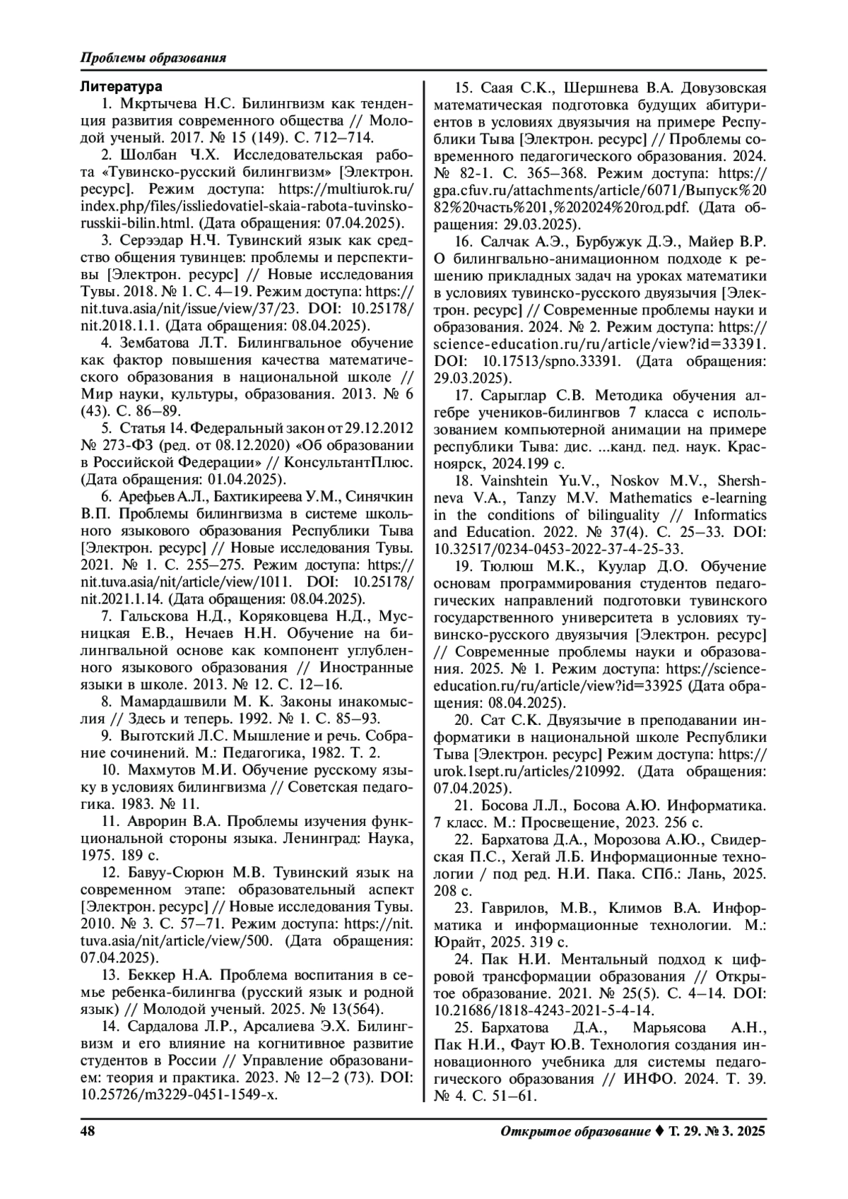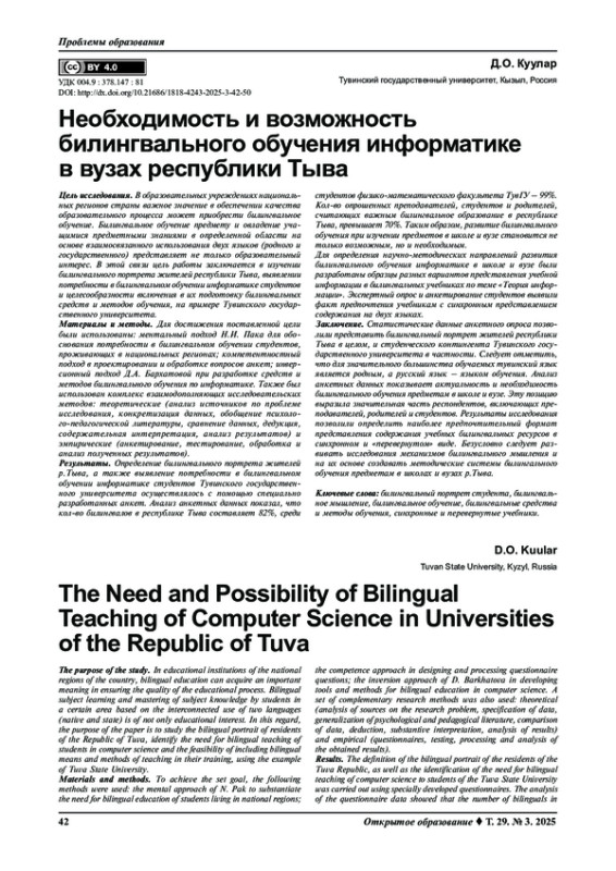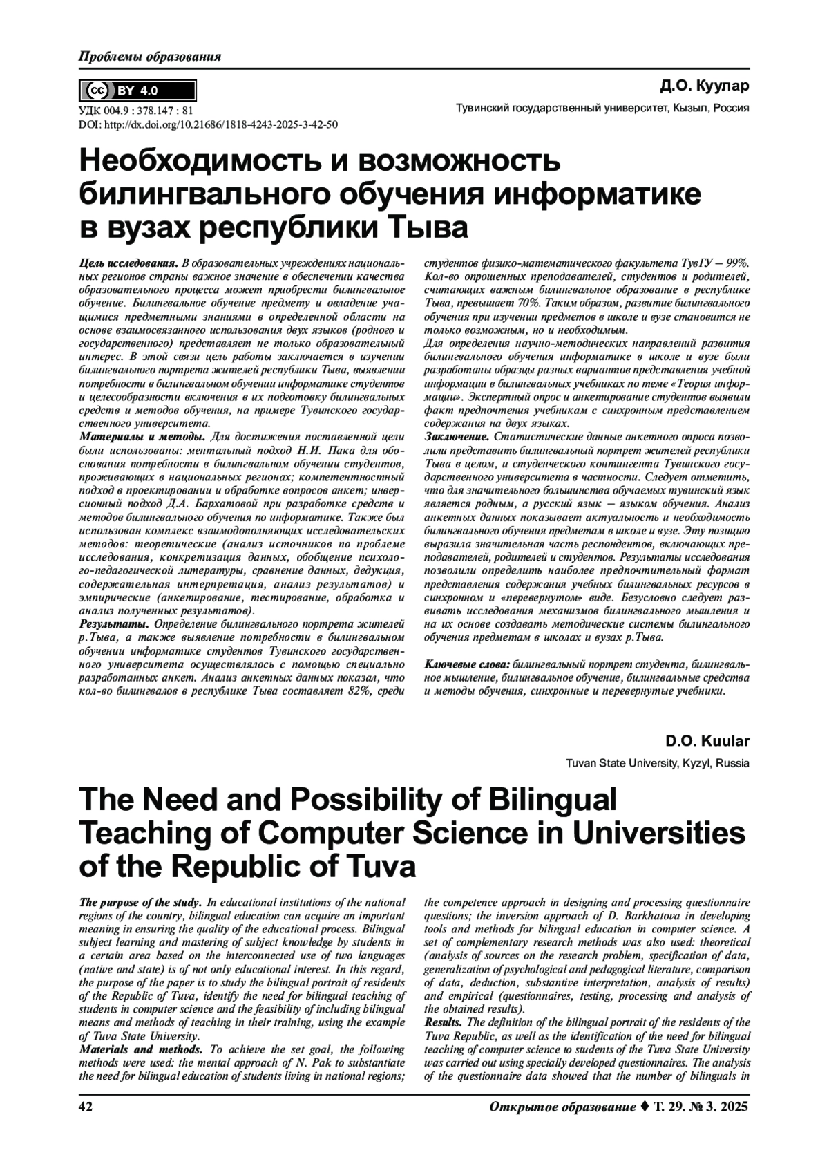 КУУЛАР Д. О. НЕОБХОДИМОСТЬ И ВОЗМОЖНОСТЬ БИЛИНГВАЛЬНОГО ОБУЧЕНИЯ ИНФОРМАТИКЕ В ВУЗАХ РЕСПУБЛИКИ ТЫВА // ОТКРЫТОЕ ОБРАЗОВАНИЕ. 2025. ТОМ 29, № 3
