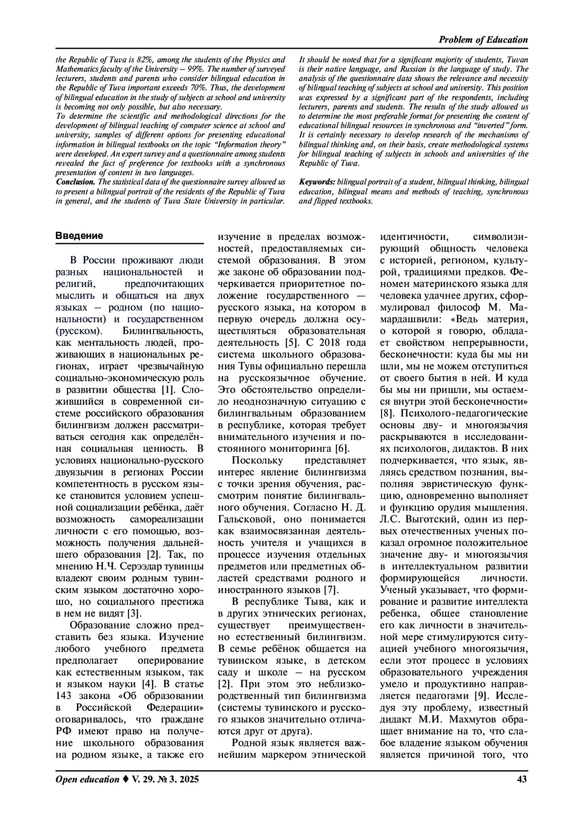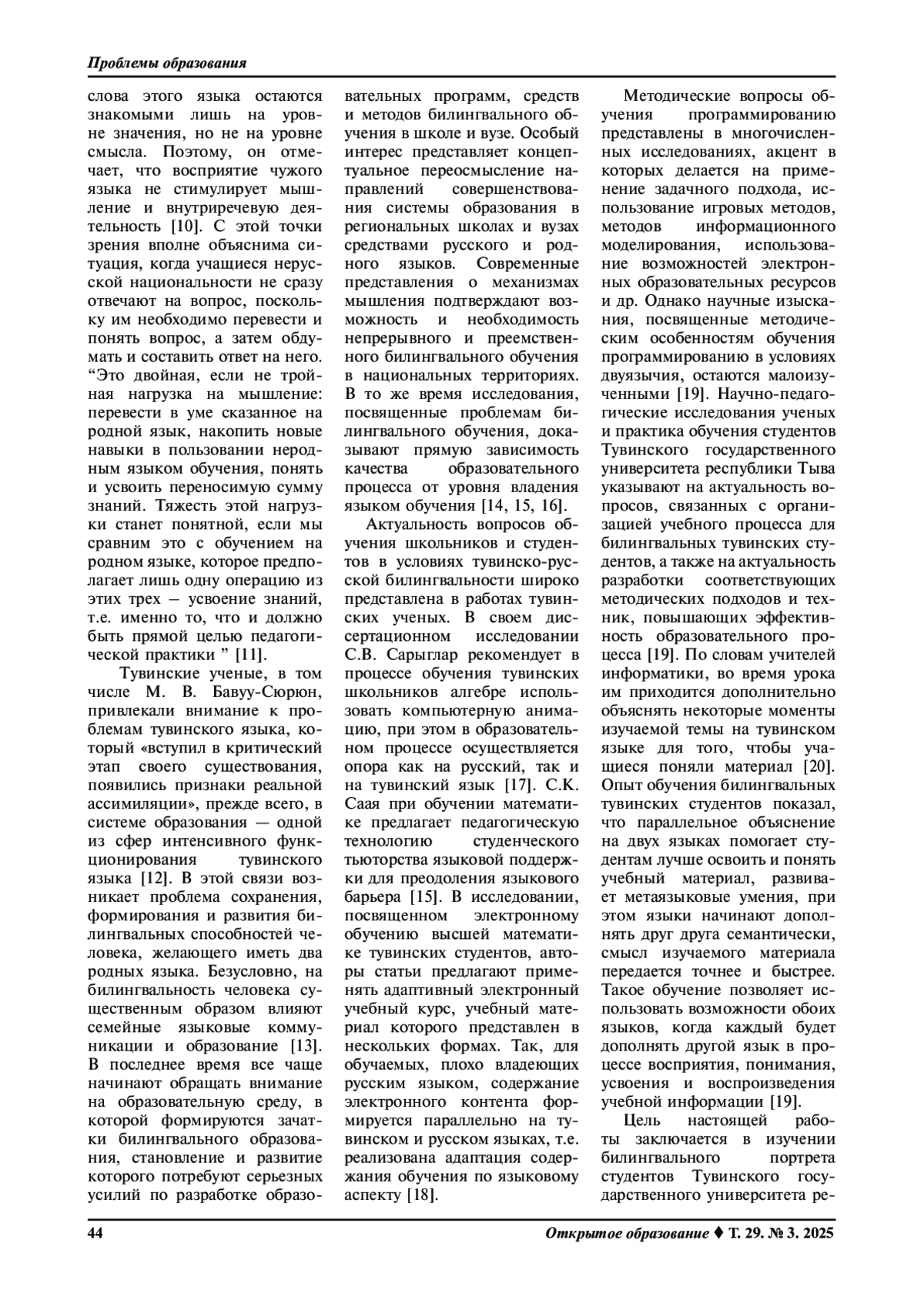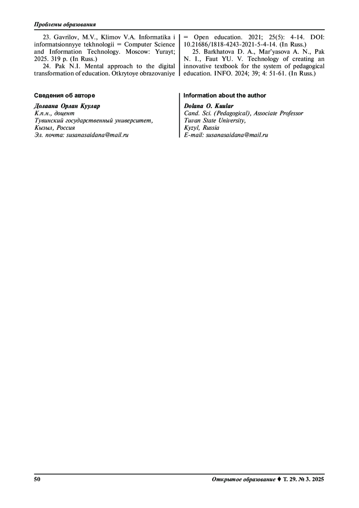 КУУЛАР Д. О. НЕОБХОДИМОСТЬ И ВОЗМОЖНОСТЬ БИЛИНГВАЛЬНОГО ОБУЧЕНИЯ ИНФОРМАТИКЕ В ВУЗАХ РЕСПУБЛИКИ ТЫВА // ОТКРЫТОЕ ОБРАЗОВАНИЕ. 2025. ТОМ 29, № 3