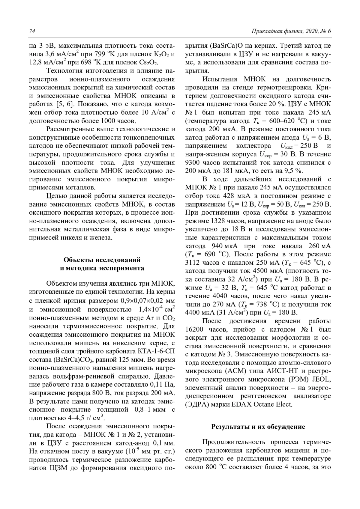 3. При оптимальных вакуумных условиях в ЦЗУ (10-8–10-9 мм рт. ст.) и рабочей температуре катода 645–650 оС, с МНОК возможен отбор тока 18 А/см2 со сроком службы более 1000 часов.