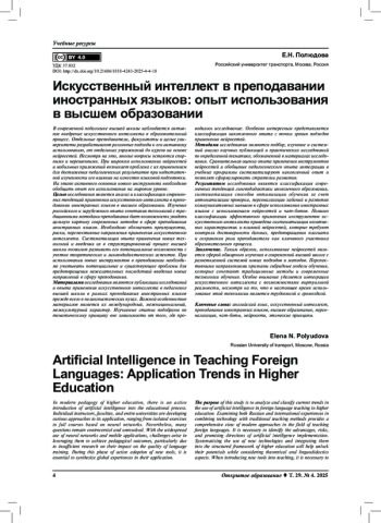 31. Титова С.В. Технологические решения на базе искусственного интеллекта в обучении иностранным языкам // Вестник Московского университета. Серия 19. Лингвистика и межкультурная коммуникация. 2024. № 2. С. 18-37.