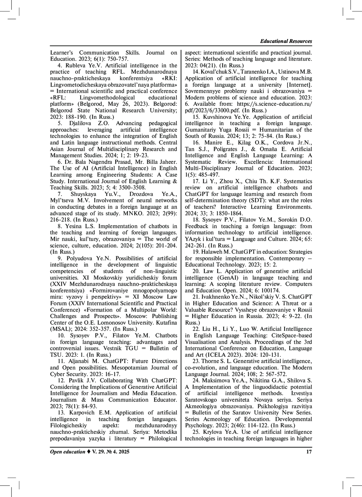 15. Кувшинова Е.Е. Применение искусственного интеллекта в обучении иностранному языку // Гуманитарий Юга России. 2024. Т. 13. № 2. С. 75-84.