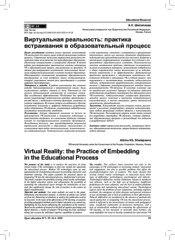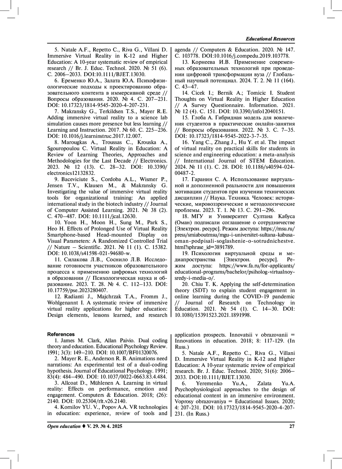Заключение. В результате анализа успешных кейсов, реализованных в различных университетах, автором систематизированы модели организации учебного процесса с использованием VR-технологий. Рассмотренные вопросы могут стать основой для разработки стандартов VR-обучения, создания адаптивных образовательных программ и рекомендаций для педагогов и разработчиков EdTech.