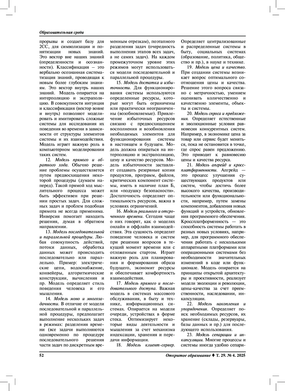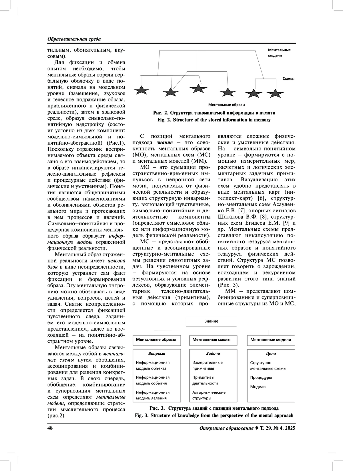 Результаты. Рассмотрение ментальных особенностей современного человека в цифровом обществе, определение 3-й сигнальной системы в связке «человек + ИКТ + искусственный интеллект», в которой основную роль играют ментальные схемы и ментальные модели, позволило сформулировать этапность целевых установок образовательного процесса в виде таксономии учебных целей. Таксономия учебных целей начинается с заданием ментальной энтропии – как предметным полем будущей профессиональной деятельности специалиста, содержащим вопросы, задачи и проблемы. Они могут быть сформулированы традиционными учебными целями в виде: знать, уметь, владеть. Конкретизация этих целей приводит к целевым ориентирам по составу, объему и содержанию предметных ментальных образов, ментальных схем и ментальных моделей. Совокупность ментальных образов, схем и моделей представляют знаниевый блок. Параллельно ему задается восходящий целевой блок универсальных когнитивных операций, которыми должен овладеть современный специалист. Вершиной таксономии является вычислительное мышление. На основе ментальной модели мышления выявлена сущность вычислительного мышления и составлен набор универсальных когнитивных операций. Сформирован базовый состав ментальных моделей, определяющих когнитивное поведение человека в цифровом обществе.