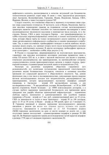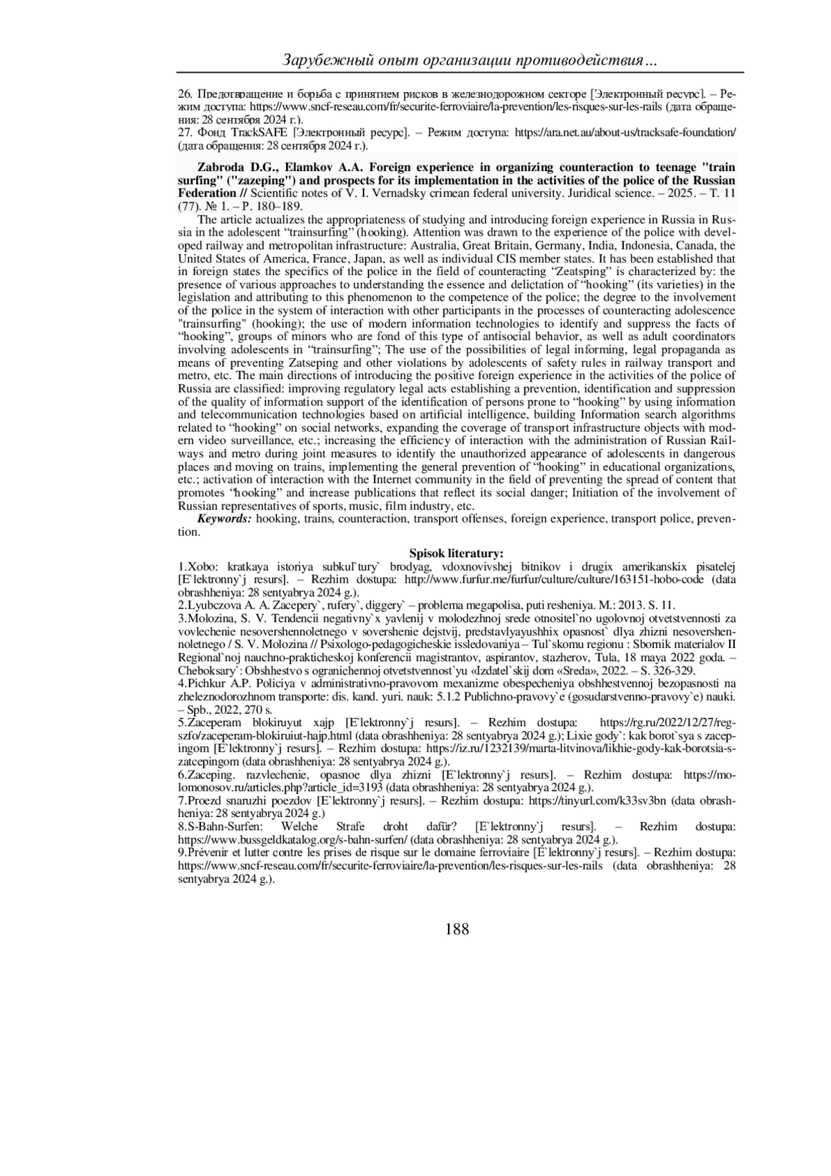 В статье актуализируется вопрос целесообразности изучения и внедрения в России зарубежного опыта противодействия подростковому «трейнсерфингу» (зацепингу). Обращено внимание на опыт полиции государств с развитой железнодорожной и метрополитенной инфраструктурой: Австралии, Великобритании, Германии, Индии, Индонезии, Канады, США, Франции, Японии, а также отдельных государств-членов СНГ. Установлено, что в зарубежных государствах специфика деятельности полиции в области противодействия «зацепингу» характеризуется: наличием различных подходов к пониманию сущности и деликтации «зацепинга» (его разновидностей) в законодательстве и отнесении противодействия этому явлению к компетенции полиции; степенью вовлечения полиции в систему взаимодействия с другими участниками процессов противодействия подростковому «трейнсерфингу» (зацепингу); применение современных информационных технологий для выявления и пресечения фактов «зацепинга», групп несовершеннолетних, увлекающихся этим видом антиобщественного поведения, а также взрослых-координаторов, вовлекающих подростков в «трейнсерфинг»; использованием полицией возможностей правового информирования, правовой пропаганды как средств профилактики «зацепинга» и других нарушений подростками правил безопасности на железнодорожном транспорте и метро и др. К основным направлениям внедрения рассмотренного нами положительного зарубежного опыта в деятельность полиции России отнесены: совершенствование нормативных правовых актов, устанавливающих предупреждение, выявления и пресечение улучшение качества информационного обеспечения выявления лиц, склонных к «зацепингу» путем использования информационно-телекоммуникационных технологий на основе искусственного интеллекта, построения алгоритмов поиска информации, связанной с «зацепингом» в социальных сетях, расширения покрытия объектов транспортной инфраструктуры современными средствами видеонаблюдения и др.; повышение эффективности взаимодействия с администрацией РЖД и метрополитенов в ходе проведения совместных мероприятий по выявлению несанкционированного появления подростков в опасных местах и перемещения в поездах, осуществления общей профилактики «зацепинга» в образовательных организациях и т. п.; активизация взаимодействия с интернет-сообществом в области недопущения распространения контента, пропагандирующего «зацепинг» и увеличения публикаций, отражающих его общественную опасность; инициирование вовлечения в пропагандистские акции известных молодежи российских представителей спорта, музыки, киноиндустрии и др.