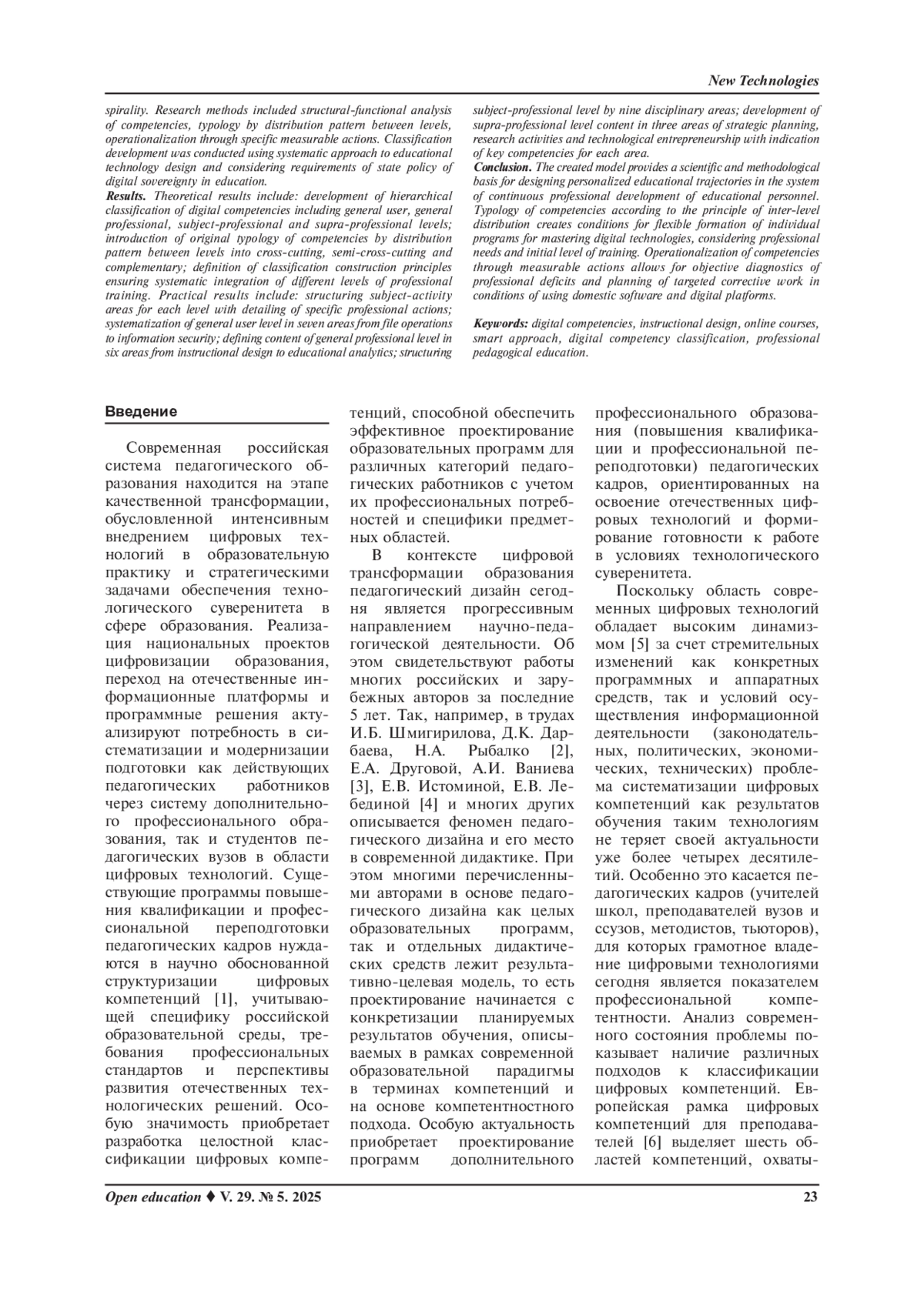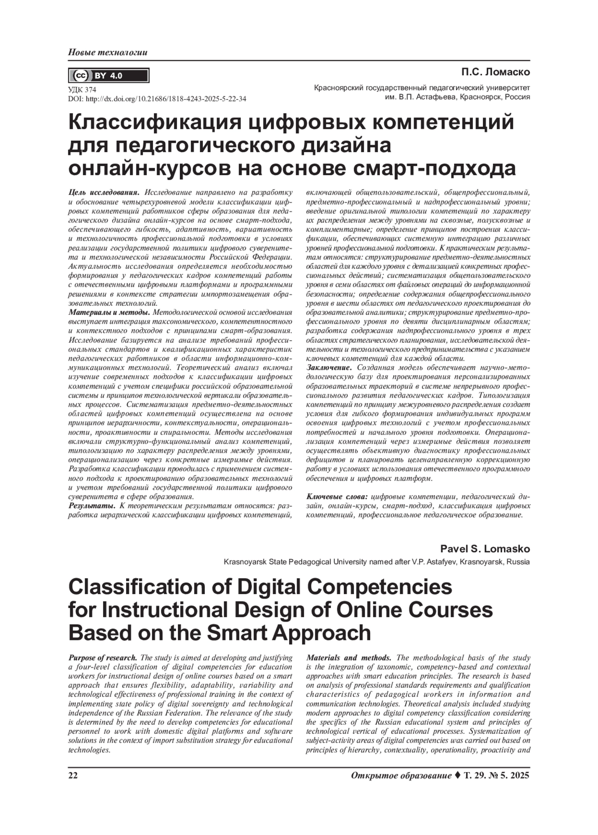 Цель исследования. Исследование направлено на разработку и обоснование четырехуровневой модели классификации цифровых компетенций работников сферы образования для педагогического дизайна онлайн-курсов на основе смарт-подхода, обеспечивающего гибкость, адаптивность, вариативность и технологичность профессиональной подготовки в условиях реализации государственной политики цифрового суверенитета и технологической независимости Российской Федерации. Актуальность исследования определяется необходимостью формирования у педагогических кадров компетенций работы с отечественными цифровыми платформами и программными решениями в контексте стратегии импортозамещения образовательных технологий.