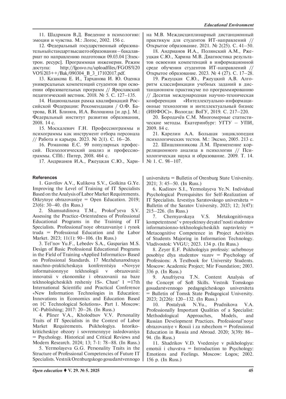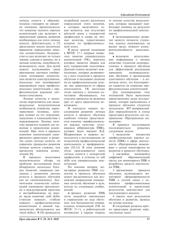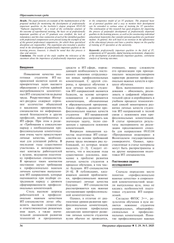 Заключение. Результаты исследования подтверждают актуальность утверждения о значимости профессионально важных качеств в компетентностной модели выпускника ИТ-направления. Предложенный базовый набор личных качеств и способ реализации мониторинга их развития могут быть распространены на различные направления подготовки ИТ-специалистов. Продолжение данного исследования имеет хорошие перспективы для организации процесса целенаправленного развития профессионально важных качеств в процессе обучения, а также для построения индивидуальных образовательных траекторий, учитывающих личные качества студента. В целом это приведёт к повышению эффективности учебного процесса и окажет положительное влияние на качество подготовки ИТ-специалистов в вузе.