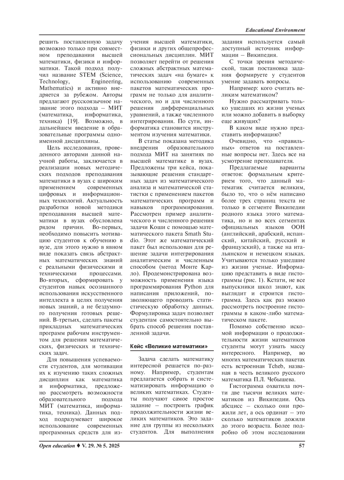 Заключение. Рассмотренный в статье образовательный подход МИТ позволяет широко использовать современные информационные и цифровые технологии для изучения высшей математики в вузах. Данный подход ведет к повышению интереса студентов к изучаемым дисциплинам, формирует навыки использования языка программирования Python и пакета прикладных математических программ Smath Studio для аналитического и численного решения сложных математических задач.