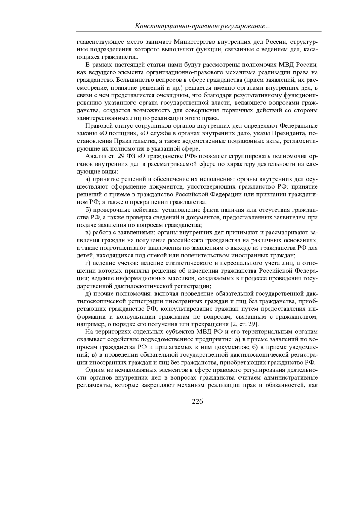 10. Масталиев К. Т. Прекращение гражданства вследствие совершения преступления и действий, создающих угрозу национальной безопасности РФ: порядок, процедура, различия и общие черты / К. Т. Масталиев // Проблемы права. - 2024. - № 1(93). - С. 24-27. EDN: UKLBEC 11. Пронякина С. Ю. Двойное и множественное гражданство в Российской Федерации: перспективы-развития правового регулирования / С. Ю. Пронякина // Известия Саратовского университета. Новая серия. Серия: Экономика. Управление. Право. - 2024. - Т. 24, № 2. - С. 203-210. EDN: FRWJXC