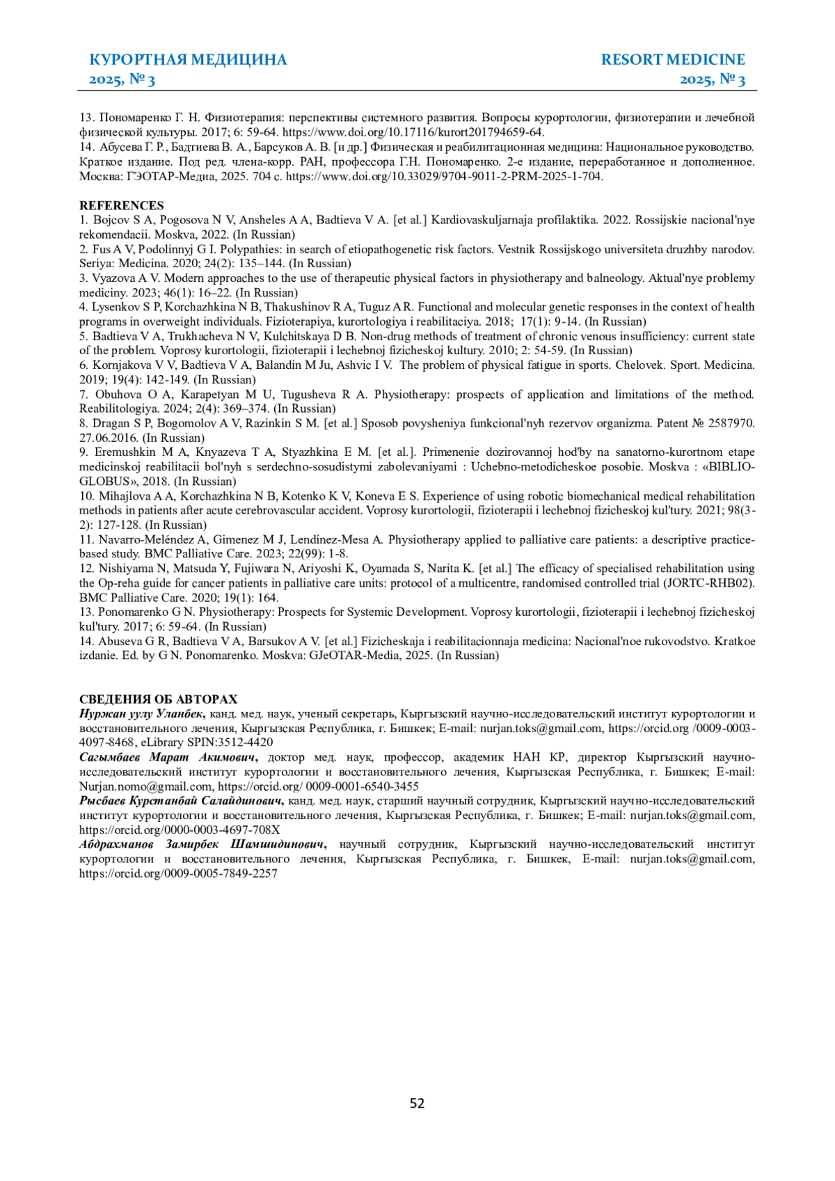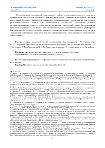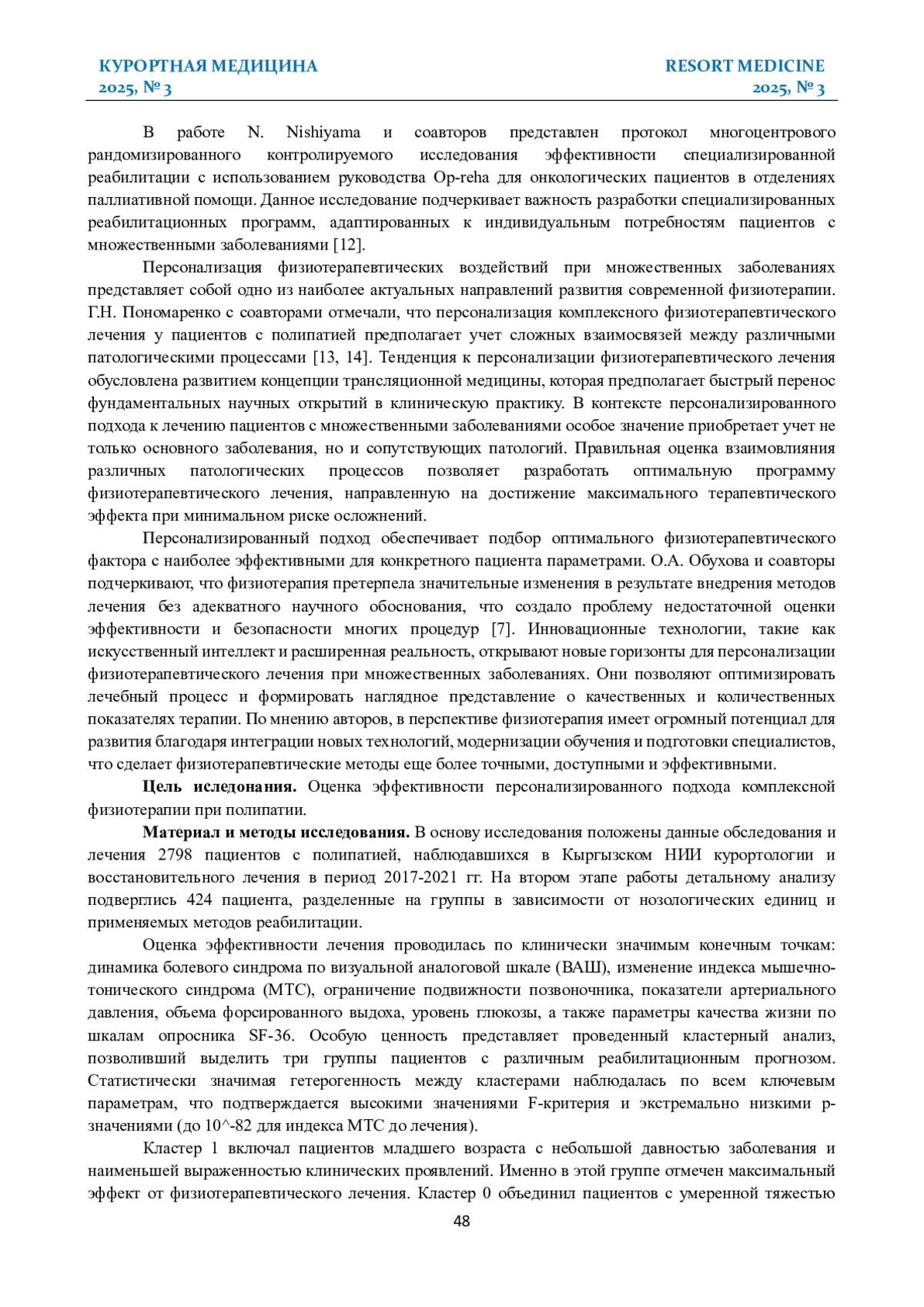 НУРЖАН У. У., САГЫМБАЕВ М. А., РЫСБАЕВ К. С., АБДРАХМАНОВ З. Ш. ПЕРСОНАЛИЗАЦИЯ КОМПЛЕКСНОЙ ФИЗИОТЕРАПИИ БОЛЬНЫХ С ПОЛИПАТИЕЙ // КУРОРТНАЯ МЕДИЦИНА. 2025. № 3