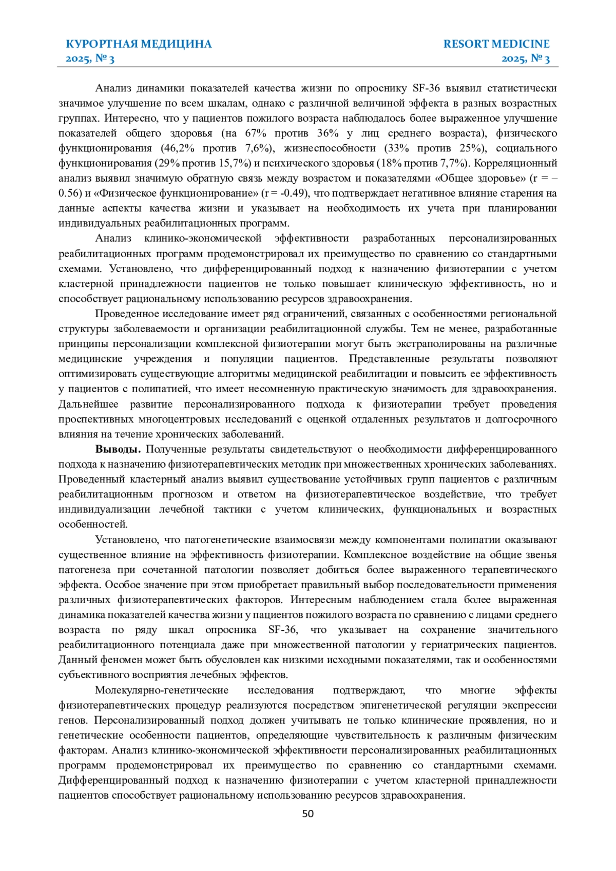 Ключевые фразы: полипатия, комплексная физиотерапия, персонализированная медицина, реабилитация, кластерный анализ, качество жизни, коморбидность, дорсопатия, реабилитационный прогноз