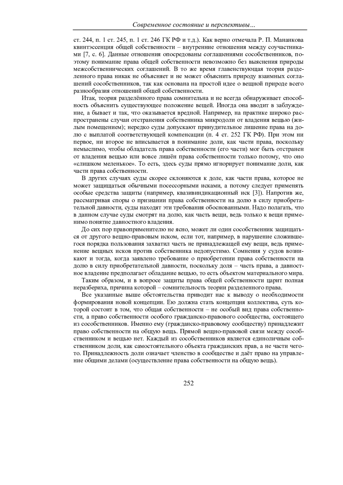 Обычно право собственности делят на единоличное и общее, а общее - на долевое и совместное. Считается, что право общей долевой собственности характеризуется тем, что оно распределено среди участников по долям. Теория, согласно которой участники делят между собой право, условно называется «теорией разделенного права». В статье обосновывается, что главенствующая ныне теория разделенного права устарела. Она нелогична, противоречива с точки зрения науки и непригодна в практической деятельности. На её смену должна прийти концепция коллектива, которая считает, что право общей собственности - не особый вид права собственности, а право собственности гражданско-правового сообщества. Данный подход сохранит понимание права собственности как неограниченного и исключительного господства над вещью, а также внесёт определенность в правоприменительную практику. Концепция коллектива раскроет природу доли и соглашений сособственников; упорядочит судебную практику в вопросах защиты права собственности на общую вещь и долю; объяснит феномен дробления права собственности на вещь и долю; способствует правильному пониманию природы соглашения об определении порядка пользования общим имуществом и т. д.