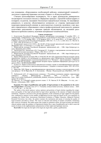 7. Кулеш Е.А. Право на бесплатную юридическую помощь и право на квалифицированную юридическую помощь: соотношение и практическая реализация // Аграрное и земельное право. 2023. № 6 (222). С. 192-194. EDN: AHXPXJ