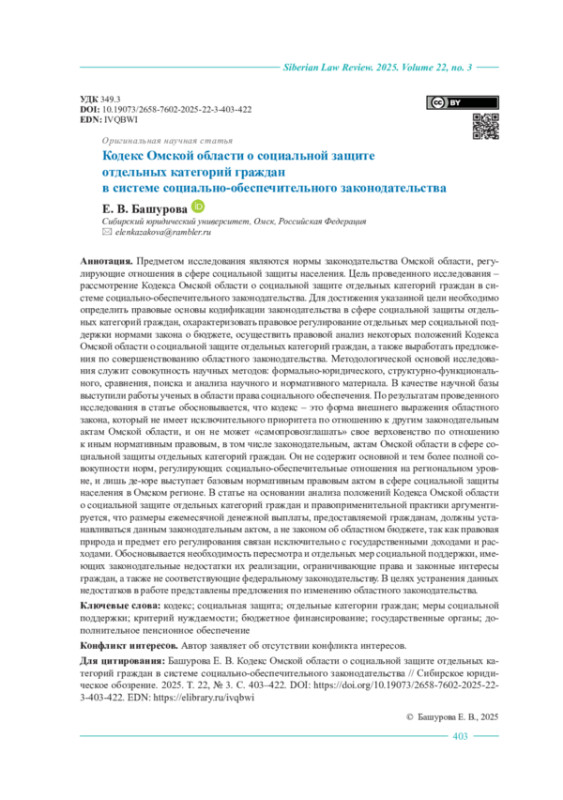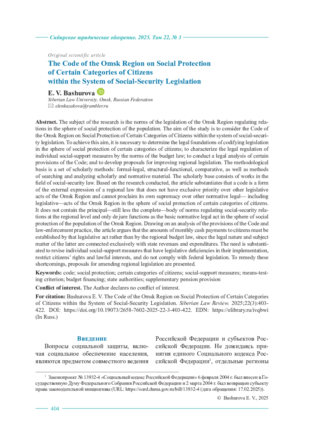 Предметом исследования являются нормы законодательства Омской области, регулирующие отношения в сфере социальной защиты населения. Цель проведенного исследования – рассмотрение Кодекса Омской области о социальной защите отдельных категорий граждан в системе социально-обеспечительного законодательства. Для достижения указанной цели необходимо определить правовые основы кодификации законодательства в сфере социальной защиты отдельных категорий граждан, охарактеризовать правовое регулирование отдельных мер социальной поддержки нормами закона о бюджете, осуществить правовой анализ некоторых положений Кодекса Омской области о социальной защите отдельных категорий граждан, а также выработать предложения по совершенствованию областного законодательства. Методологической основой исследования служит совокупность научных методов: формально-юридического, структурно-функционального, сравнения, поиска и анализа научного и нормативного материала. В качестве научной базы выступили работы ученых в области права социального обеспечения. По результатам проведенного исследования в статье обосновывается, что кодекс – это форма внешнего выражения областного закона, который не имеет исключительного приоритета по отношению к другим законодательным актам Омской области, и он не может «самопровозглашать» свое верховенство по отношению к иным нормативным правовым, в том числе законодательным, актам Омской области в сфере социальной защиты отдельных категорий граждан. Он не содержит основной и тем более полной совокупности норм, регулирующих социально-обеспечительные отношения на региональном уровне, и лишь де-юре выступает базовым нормативным правовым актом в сфере социальной защиты населения в Омском регионе. В статье на основании анализа положений Кодекса Омской области о социальной защите отдельных категорий граждан и правоприменительной практики аргументируется, что размеры ежемесячной денежной выплаты, предоставляемой гражданам, должны устанавливаться данным законодательным актом, а не законом об областном бюджете, так как правовая природа и предмет его регулирования связан исключительно с государственными доходами и расходами. Обосновывается необходимость пересмотра и отдельных мер социальной поддержки, имеющих законодательные недостатки их реализации, ограничивающие права и законные интересы граждан, а также не соответствующие федеральному законодательству. В целях устранения данных недостатков в работе представлены предложения по изменению областного законодательства.