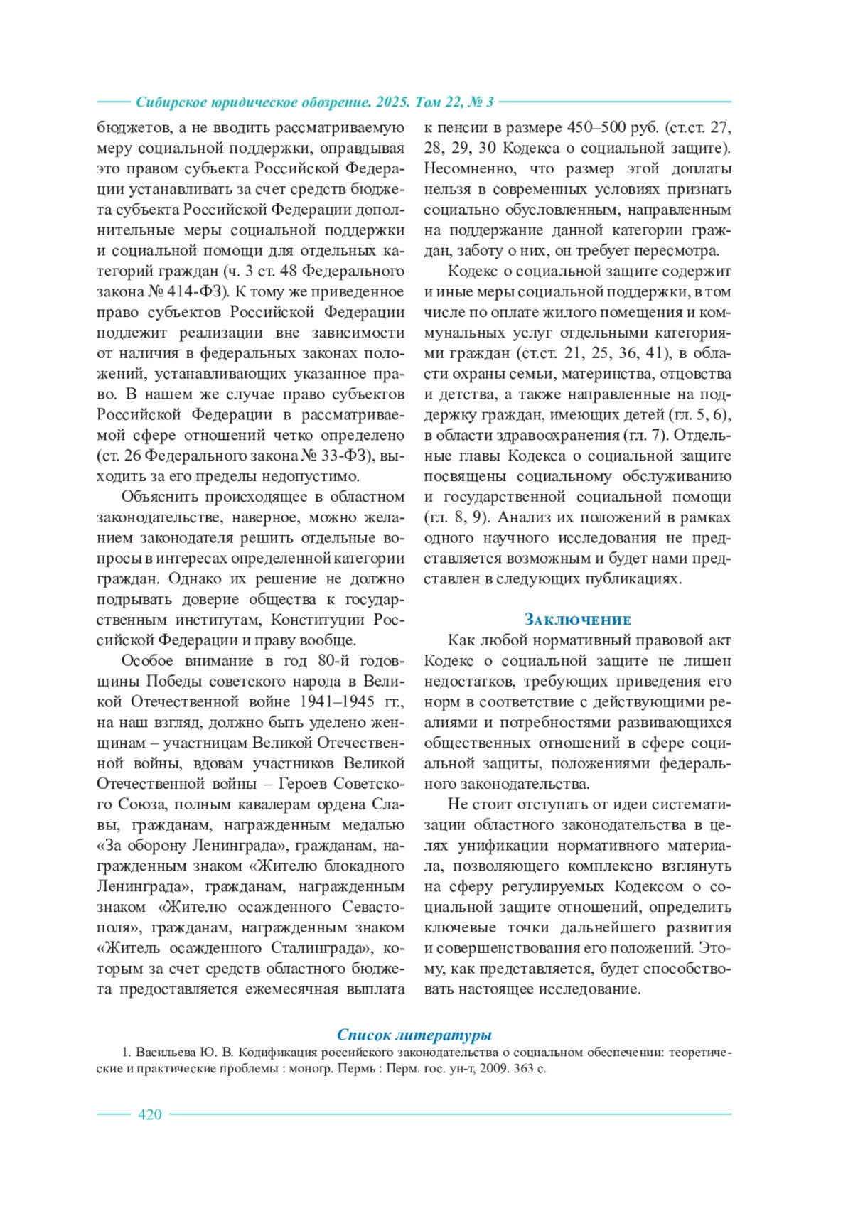 1. Васильева Ю. В. Кодификация российского законодательства о социальном обеспечении: теоретические и практические проблемы : моногр. Пермь : Перм. гос. ун-т, 2009. 363 с.