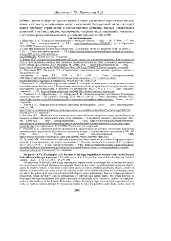 9. Рузакова О.А. “Правовой режим произведений, правообладатель которых неизвестен, (сиротские произведения): перспективы российского законодательства” // имущественные отношения в РФ, №7 (274), 2024г, с. 96-100, - Текст: непосредственный, - URL: ?ysdid=m51416dbxl561203048, Режим доступа: открытый. EDN: RZYRNR