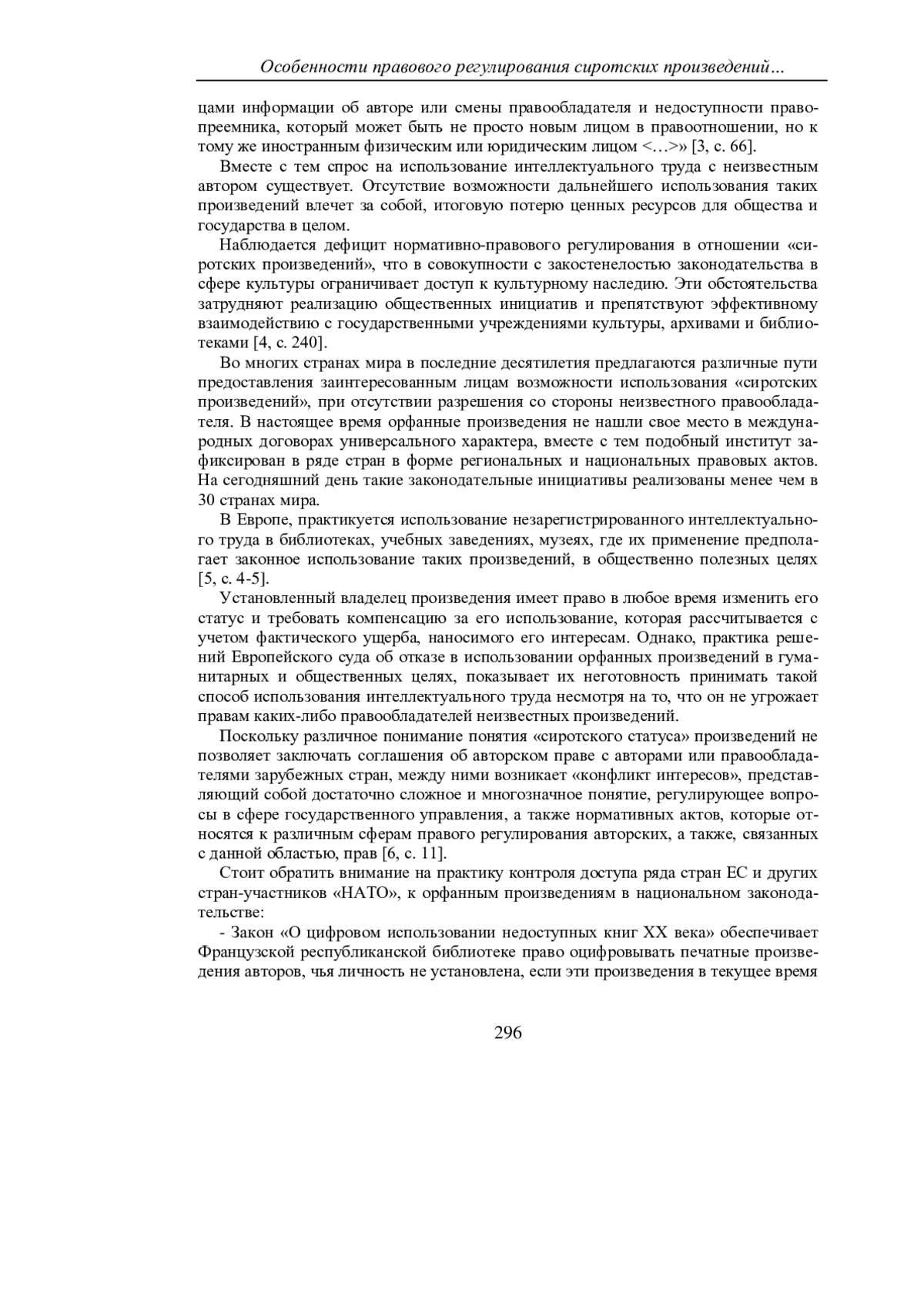 5. Барышев С.А., “Проблемы определения правовой категории произведения с недоступным автором или иным правообладателем” // Современные тенденции развития гражданского и гражданского процессуального законодательства, и практики его применения 2022 г., № 8, с. 3-7, - Текст: непосредственный, - URL: item.asp?id=50762105, Режим доступа: открытый. EDN: RPRWTH