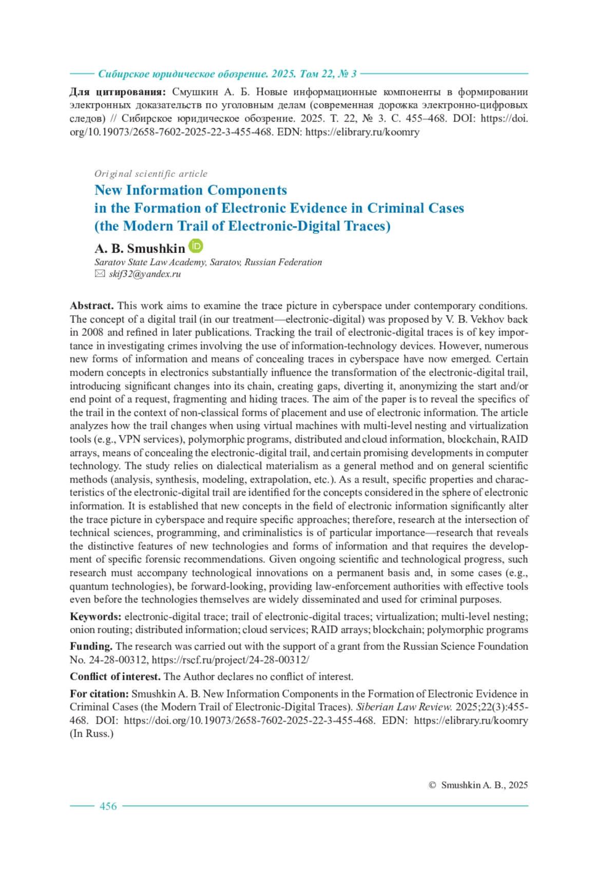 Данная работа нацелена на рассмотрение следовой картины в киберпространстве в современных условиях. Концепцию дорожки цифровых следов (в нашей трактовке – электронно-цифровых) предложил В. Б. Вехов еще в 2008 г., доработав в более поздних публикациях. Отслеживание дорожки электронно-цифровых следов имеет ключевое значение при расследовании преступлений, связанных с использованием информационно-технологических устройств. Однако в настоящее время появилось множество новых форм информации, средств сокрытия следов в киберпространстве. Некоторые современные концепты в области электронной техники оказывают существенное влияние на трансформацию дорожки электронно-цифровых следов, внося существенные изменения в ее цепочку, образуя разрывы, уводя в сторону, анонимизируя точку старта и/или финиша запроса, дробя и пряча следы. В этой связи целью работы является раскрытие специфики следовой дорожки в контексте неклассических форм размещения и использования электронной информации. Анализируется изменение дорожки электронно-цифровых следов при использовании виртуальных машин с многоуровневой вложенностью и средств виртуализации (например, VPN-сервисов), полиморфных программ, распределенной и облачной информации, блокчейна, RAID-массивов, средств сокрытия дорожки электронно-цифровых следов, отдельных перспективных разработок в области компьютерной техники. Статья основана на использовании материалистической диалектики как всеобщего метода, так и общенаучных методов (анализа, синтеза, моделирования, экстраполяции и др.). В результате исследования определены специфические свойства и характеристики дорожки электронно-цифровых следов при использовании рассмотренных концептов в области электронной информации. Констатируется, что новые концепты в области электронной информации существенно меняют следовую картину в киберпространстве и требуют специфических подходов, поэтому особое значение приобретают исследования на стыке технических наук, программирования и криминалистики, раскрывающие особые характеристики новых технологий и форм информации, требующих разработки специфических криминалистических рекомендаций. При этом, в связи с непрерывным научно-техническим прогрессом, эти исследования должны перманентно сопровождать новинки технологий, а в некоторых случаях (например, квантовых технологий) носить перспективный характер, дающий в руки правоохранительных органов действенные инструменты еще до широкого распространения самих технологий и использования их в преступных целях.
