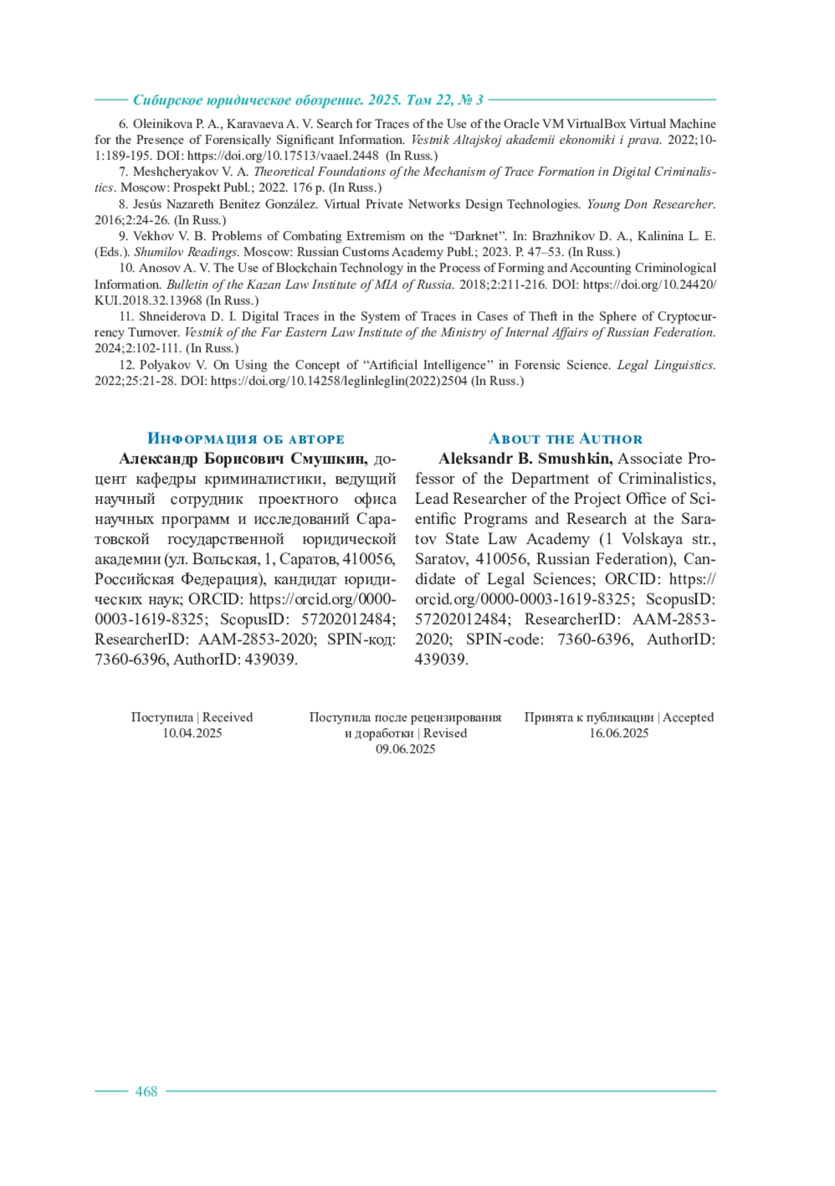 7. Мещеряков В. А. Теоретические основы механизма следообразования в цифровой криминалистике : моногр. М. : Проспект, 2022. 176 с.