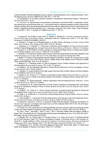 10. Блинков Д. М., Терентьева Т. В. Особенности розыска похищенных транспортных средств по горячим следам // Актуальные вопросы транспортной безопасности : сб. материалов всерос. науч.-практ. конф. (Иркутск, 24 марта 2017). Иркутск : ФГКОУ ВО ВСИ МВД России, 2017. С. 127-131.