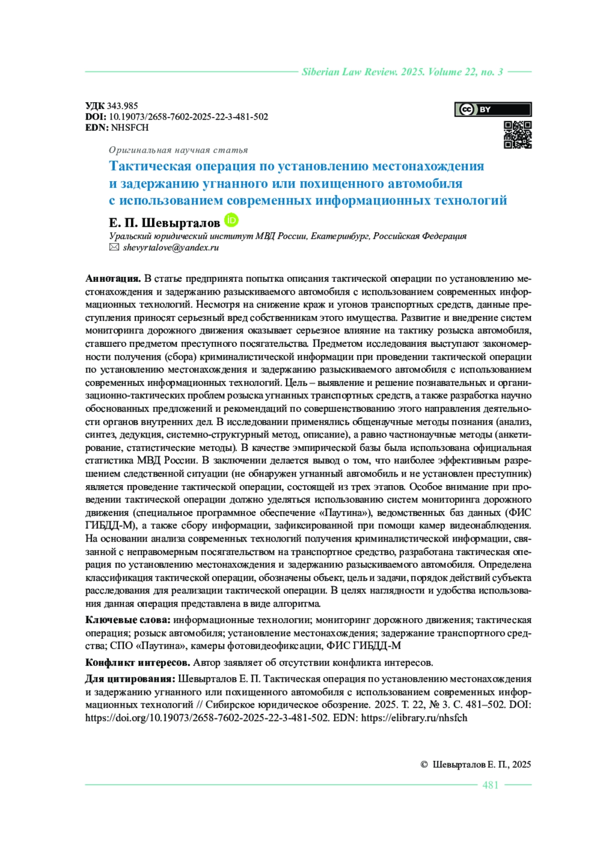 В статье предпринята попытка описания тактической операции по установлению местонахождения и задержанию разыскиваемого автомобиля с использованием современных информационных технологий. Несмотря на снижение краж и угонов транспортных средств, данные преступления приносят серьезный вред собственникам этого имущества. Развитие и внедрение систем мониторинга дорожного движения оказывает серьезное влияние на тактику розыска автомобиля, ставшего предметом преступного посягательства. Предметом исследования выступают закономерности получения (сбора) криминалистической информации при проведении тактической операции по установлению местонахождения и задержанию разыскиваемого автомобиля с использованием современных информационных технологий. Цель – выявление и решение познавательных и организационно-тактических проблем розыска угнанных транспортных средств, а также разработка научно обоснованных предложений и рекомендаций по совершенствованию этого направления деятельности органов внутренних дел. В исследовании применялись общенаучные методы познания (анализ, синтез, дедукция, системно-структурный метод, описание), а равно частнонаучные методы (анкетирование, статистические методы). В качестве эмпирической базы была использована официальная статистика МВД России. В заключении делается вывод о том, что наиболее эффективным разрешением следственной ситуации (не обнаружен угнанный автомобиль и не установлен преступник) является проведение тактической операции, состоящей из трех этапов. Особое внимание при проведении тактической операции должно уделяться использованию систем мониторинга дорожного движения (специальное программное обеспечение «Паутина»), ведомственных баз данных (ФИС ГИБДД-М), а также сбору информации, зафиксированной при помощи камер видеонаблюдения. На основании анализа современных технологий получения криминалистической информации, связанной с неправомерным посягательством на транспортное средство, разработана тактическая операция по установлению местонахождения и задержанию разыскиваемого автомобиля. Определена классификация тактической операции, обозначены объект, цель и задачи, порядок действий субъекта расследования для реализации тактической операции. В целях наглядности и удобства использования данная операция представлена в виде алгоритма.