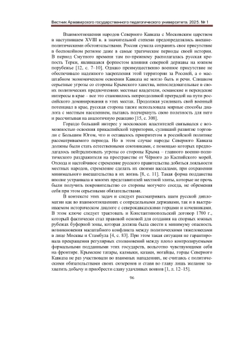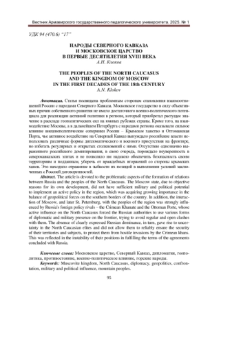 Статья посвящена проблемным сторонам становления взаимоотношений России с народами Северного Кавказа. Московское государство в силу объективных причин собственного развития не имело достаточного военно-политического потенциала для реализации активной политики в регионе, который приобретал растущее значение в раскладе геополитических сил на южных рубежах страны. Кроме того, на взаимодействие Москвы, а в дальнейшем Петербурга с народами региона оказывали сильное влияние внешнеполитические соперники России - Крымское ханство и Оттоманская Порта, чье активное воздействие на Северный Кавказ вынуждало российские власти использовать различные формы дипломатического и военного присутствия на фронтире, но избегать регулярных и открытых столкновений с ними. Отсутствие однозначно выраженного российского доминирования, в свою очередь, порождало неуверенность в северокавказских элитах и не позволяло им надежно обеспечить безопасность своим территориям и подданным, уберечь от враждебных вторжений со стороны крымских ханов. Это находило отражение в зыбкости их позиций в выполнении условий заключенных с Россией договоренностей.