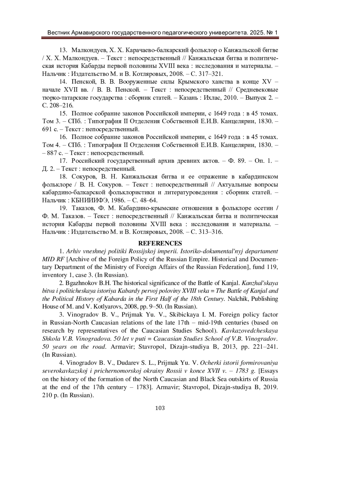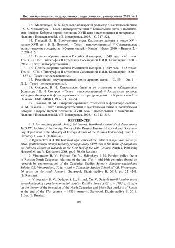 13. Малкондуев, Х. Х. Карачаево-балкарский фольклор о Канжальской битве / Х. Х. Малкондуев. - Текст: непосредственный // Канжальская битва и политическая история Кабарды первой половины XVIII века: исследования и материалы. - Нальчик: Издательство М. и В. Котляровых, 2008. - С. 317-321. EDN: RDHLBB