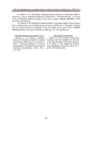 18. Сокуров, В. Н. Канжальская битва и ее отражение в кабардинском фольклоре / В. Н. Сокуров. - Текст: непосредственный // Актуальные вопросы кабардино-балкарской фольклористики и литературоведения: сборник статей. - Нальчик: КБНИИИФЭ, 1986. - С. 48-64.