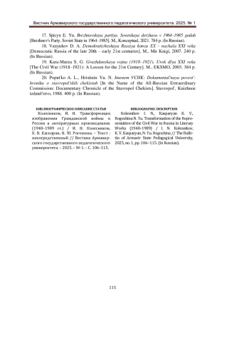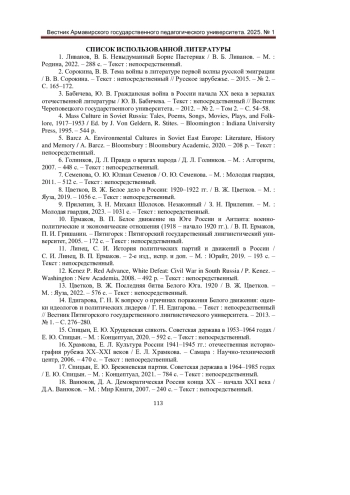 3. Бабичева, Ю. В. Гражданская война в России начала XX века в зеркалах отечественной литературы / Ю. В. Бабичева. - Текст: непосредственный // Вестник Череповецкого государственного университета. - 2012. - № 2. - Том 2. - С. 54-58. EDN: PCDGVR