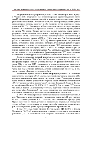 Ведущие историки суворовских училищ – А. И. Владимиров и Н. З. Кунц – к 70-летию СВУ представили свое видение периодов в развитии данного института [7]. Однако предложенная в их работе периодизация, на наш взгляд, требует уточнения и детализации. Это связано с тем, что некоторые выделенные указанными авторами периоды включают в себя разные по сути и содержанию этапы развития СВУ. Так, Владимиров и Кунц выделяют в качестве первого периода истории СВУ значительный временной отрезок – от создания первых училищ до начала 70-х годов.