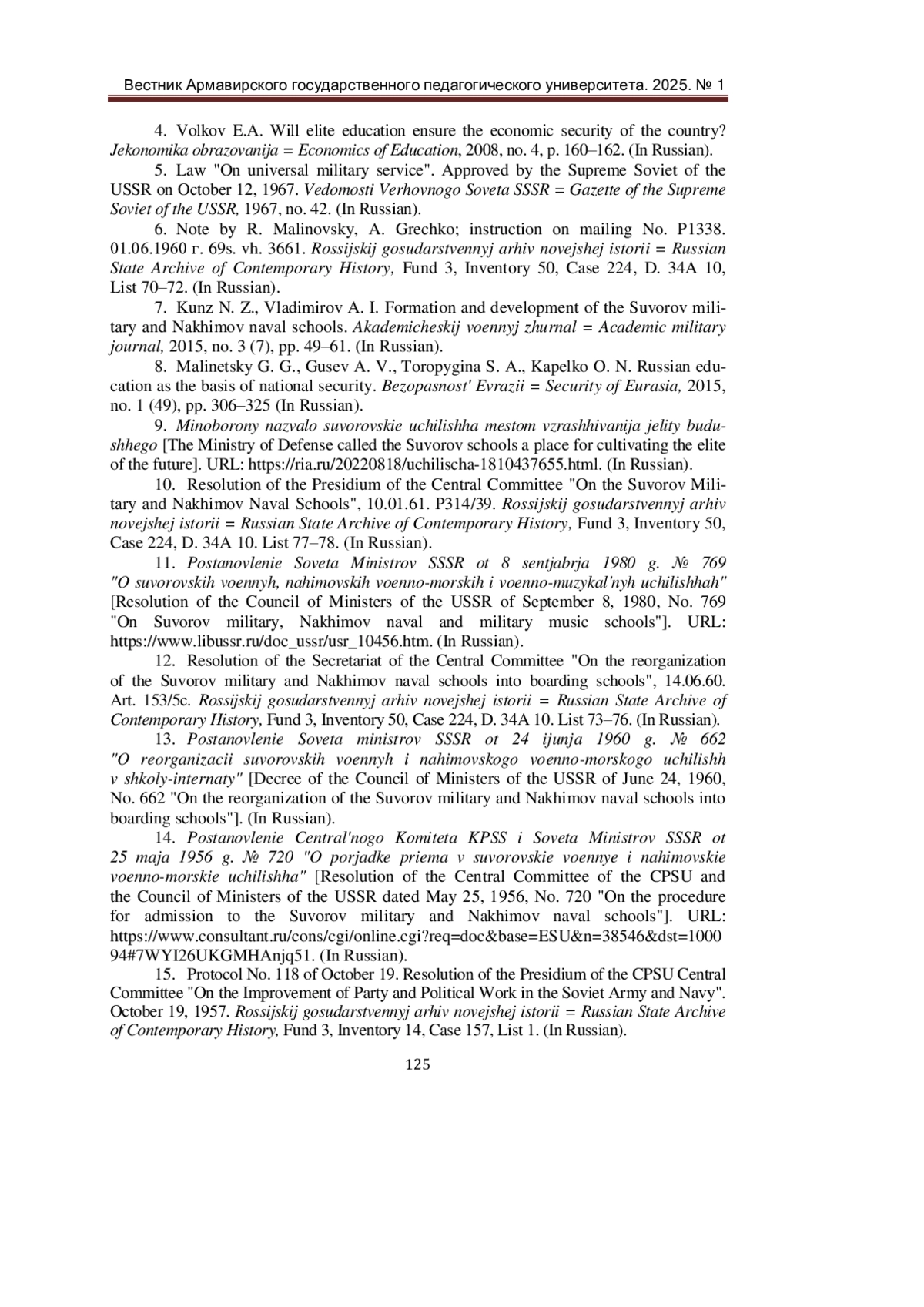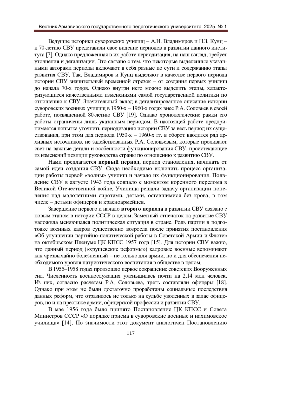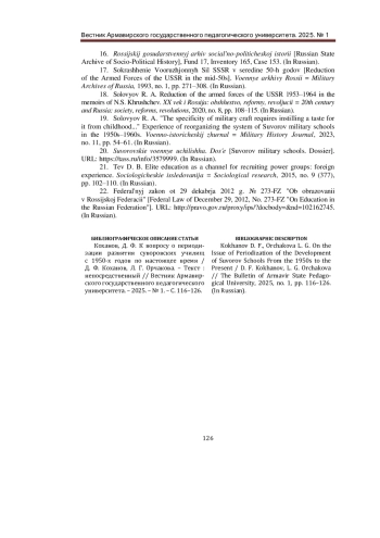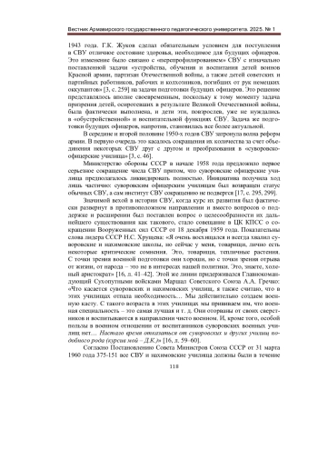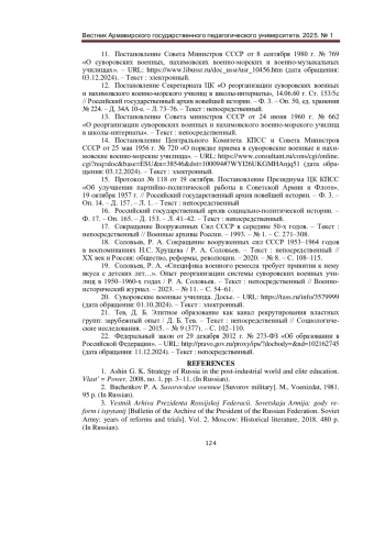19. Соловьев, Р. А. “Специфика военного ремесла требует привития к нему вкуса с детских лет…”. Опыт реорганизации системы суворовских военных училищ в 1950-1960-х годах / Р. А. Соловьев. - Текст: непосредственный // Военно-исторический журнал. - 2023. - № 11. - С. 54-61. EDN: GLDIRZ