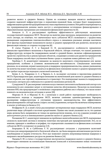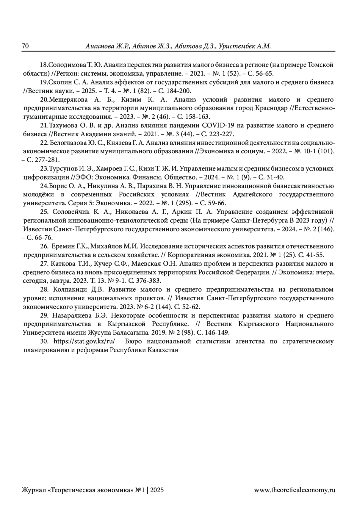 29. Назаралиева Б.Э. Некоторые особенности и перспективы развития малого и среднего предпринимательства в Кыргызской Республике. // Вестник Кыргызского Национального Университета имени Жусупа Баласагына. 2019. № 2 (98). С. 146-149. EDN: SFTSOZ