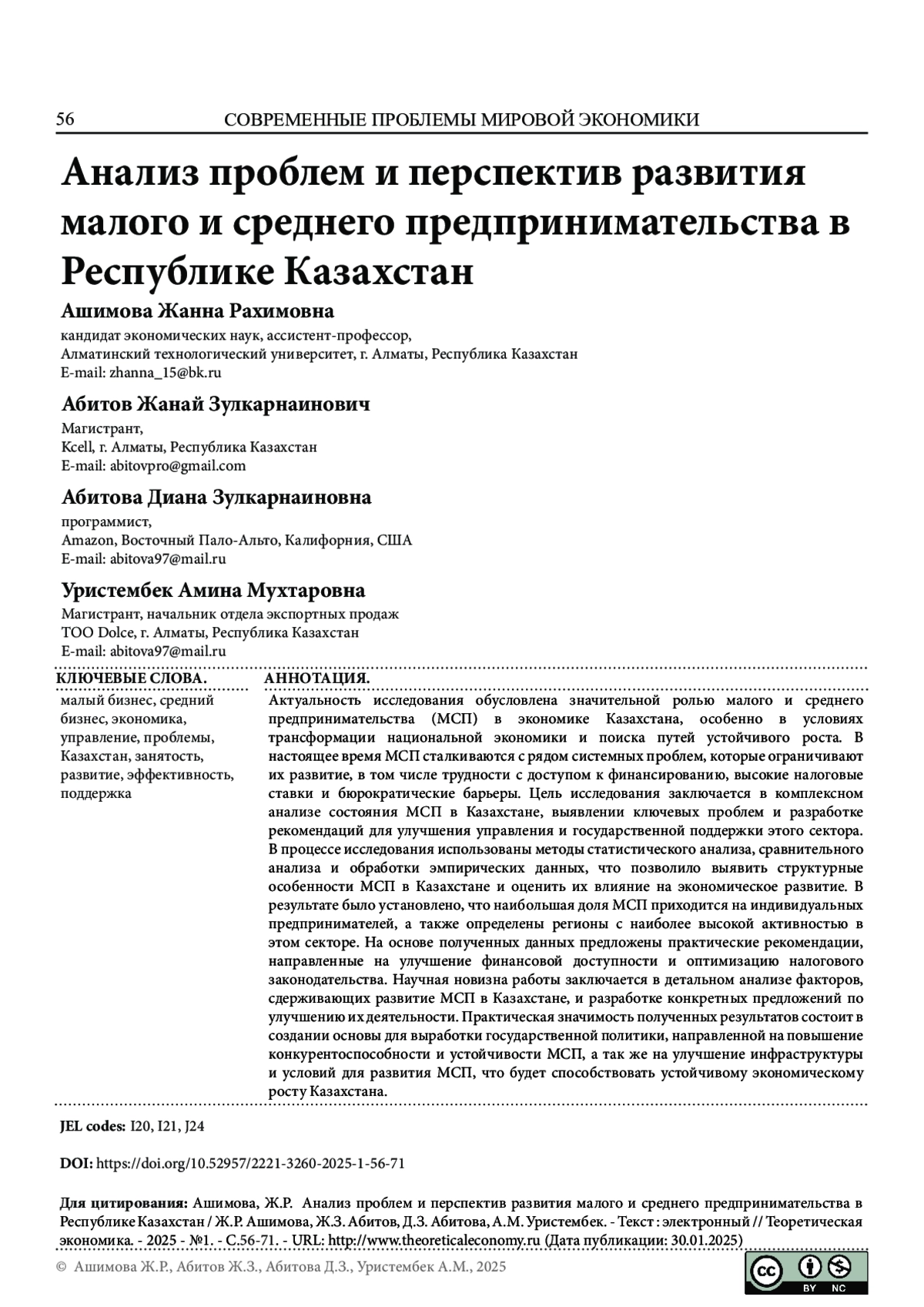 Актуальность исследования обусловлена значительной ролью малого и среднего предпринимательства (МСП) в экономике Казахстана, особенно в условиях трансформации национальной экономики и поиска путей устойчивого роста. В настоящее время МСП сталкиваются с рядом системных проблем, которые ограничивают их развитие, в том числе трудности с доступом к финансированию, высокие налоговые ставки и бюрократические барьеры. Цель исследования заключается в комплексном анализе состояния МСП в Казахстане, выявлении ключевых проблем и разработке рекомендаций для улучшения управления и государственной поддержки этого сектора. В процессе исследования использованы методы статистического анализа, сравнительного анализа и обработки эмпирических данных, что позволило выявить структурные особенности МСП в Казахстане и оценить их влияние на экономическое развитие. В результате было установлено, что наибольшая доля МСП приходится на индивидуальных предпринимателей, а также определены регионы с наиболее высокой активностью в этом секторе. На основе полученных данных предложены практические рекомендации, направленные на улучшение финансовой доступности и оптимизацию налогового законодательства. Научная новизна работы заключается в детальном анализе факторов, сдерживающих развитие МСП в Казахстане, и разработке конкретных предложений по улучшению их деятельности. Практическая значимость полученных результатов состоит в создании основы для выработки государственной политики, направленной на повышение конкурентоспособности и устойчивости МСП, а так же на улучшение инфраструктуры и условий для развития МСП, что будет способствовать устойчивому экономическому росту Казахстана.