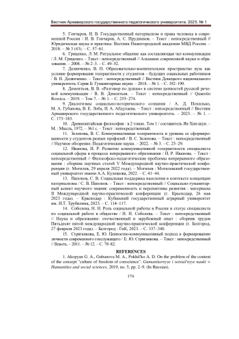 1. Акопян, Г. А. К проблеме содержания понятия “культура свободы совести” / Г. А. Акопян, М. А. Губанова, А. Д. Похилько. - Текст: непосредственный // Гуманитарные и социальные науки. - 2019. - № 5. - С. 2-9. EDN: EYNXYI