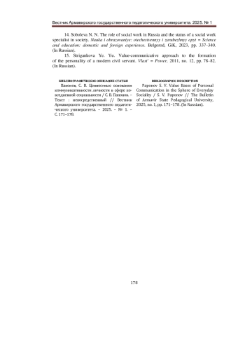 15. Стриганкова, Е. Ю. Ценностно-коммуникативный подход к формированию личности современного госслужащего / Е. Ю. Стриганкова. - Текст: непосредственный // Власть. - 2011. - № 12. - С. 78-82. EDN: OMTSND