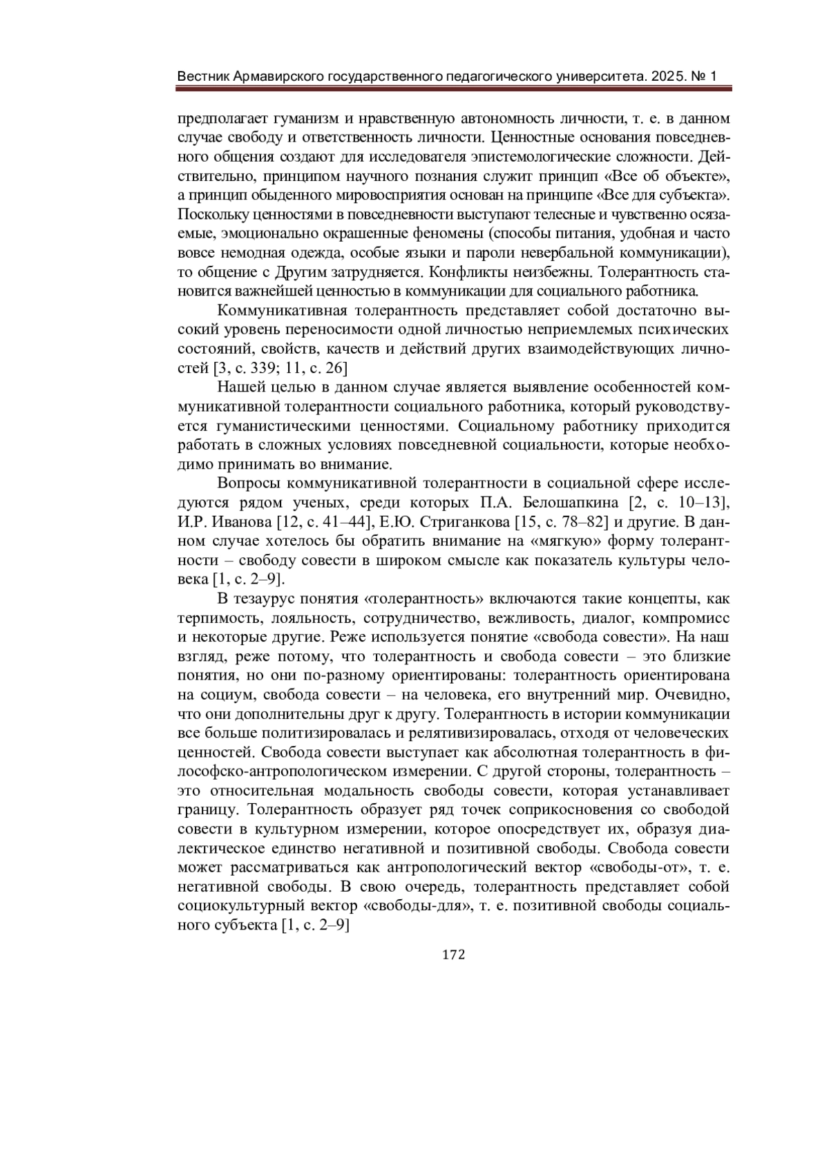 12. Иванова, И. Р. Развитие коммуникативной толерантности специалиста социальной сферы в процессе непрерывного образования / И. Р. Иванова. - Текст: непосредственный // Философско-педагогические проблемы непрерывного образования: сборник научных статей V Международной научно-практической конференции (г. Могилев, 29 апреля 2022 года). - Могилев: Могилевский государственный университет имени А.А. Кулешова, 2022. - С. 41-44. EDN: PDOGLF